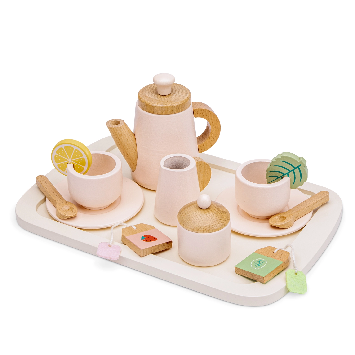 Nodig knuffels en vriendjes uit voor een stijlvol theekransje met een prachtige houten set voor kinderen vanaf 2 jaar. De set bevat een theepot met deksel, 2 kopjes met schoteltjes, een melkkan, een suikerpot, lepeltjes, theezakjes, een schijfje citroen, een muntblaadje en een ruim dienblad. Stimuleert de fijne motoriek, fantasie en sociaal spel en past dankzij het natuurlijke hout en de zachte kleuren prachtig in de kinderkamer.