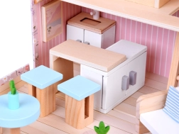 Open het bloemenkoffertje en stap binnen in een knus poppenhuis met twee verdiepingen. Boven vind je een slaapkamer met bed en dekbedje, spiegel en een retro hobbelpaardje; beneden een open woonkamer met kitchenette – ideaal voor een five-o-clock tea, samen koken en ontspannen. Alle onderdelen zijn van glad hout met een duurzame afwerking, ontworpen voor kleine kinderhanden.