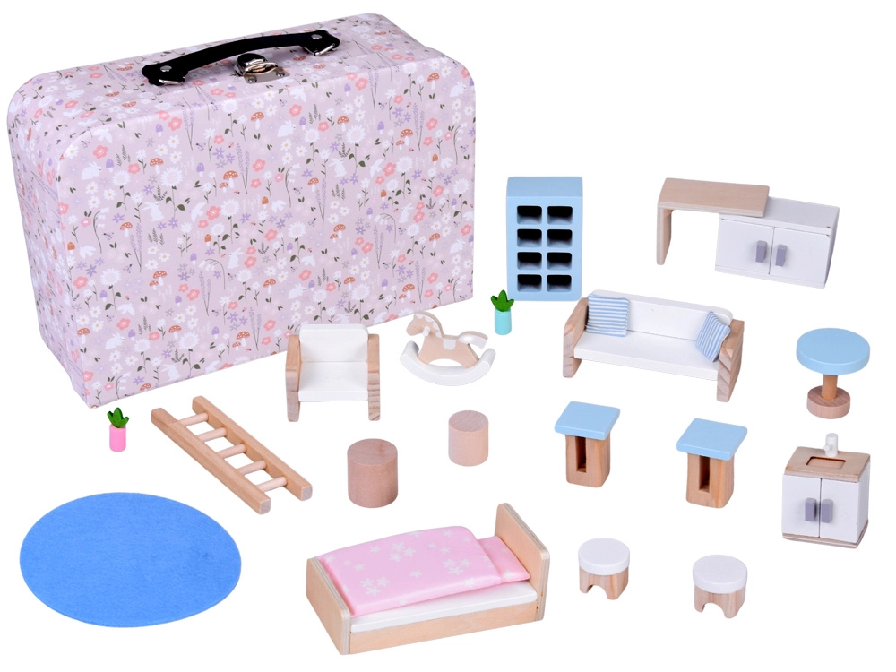Schattig tweelaags poppenhuis verborgen in een bloemenkoffertje dat spelen en praktisch opbergen combineert. Het opklapbare koffertje dient als speelhuis én opbergbox. Inclusief veel houten meubels in zachte pasteltinten – een bed met dekbedje, bank, fauteuil, tafel, tafeltjes, kastjes, plankjes, stoeltjes, kleedje en een stokpaardje. Dankzij het handvat is de set makkelijk draagbaar, compact en ideaal voor creatief spel en het stimuleren van de fantasie thuis en onderweg.