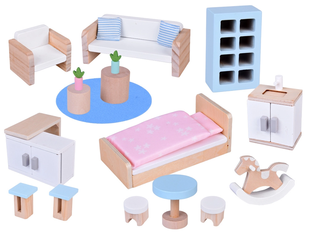 Een bed met dekbedje, bank, fauteuil, tafeltjes, stoeltjes, keukenkast, kastjes, plankjes, ladder, kleedje, stokpaardje en plantjes – alles in zachte pasteltinten voor creatief inrichten.