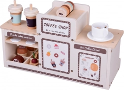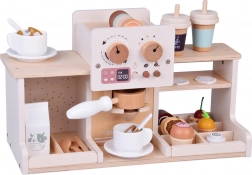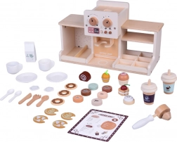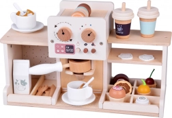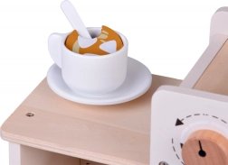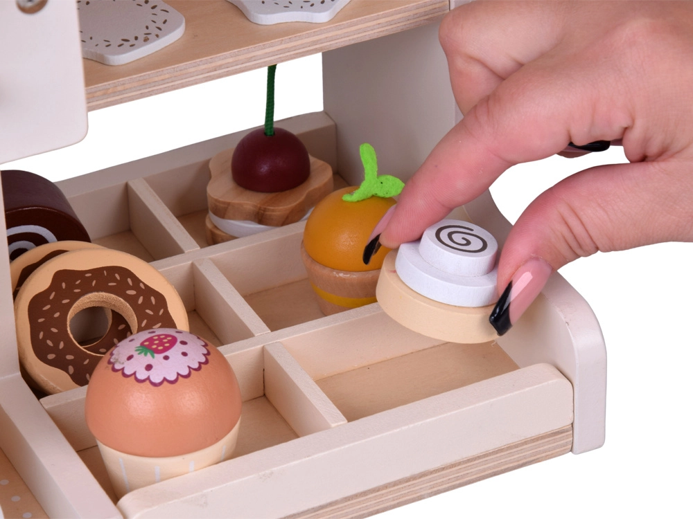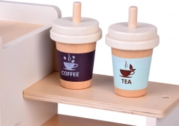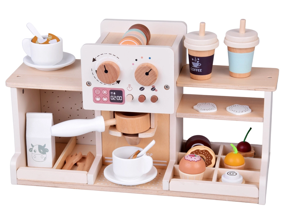 Ontdek de magie van de baristawereld met deze houten koffiebar die eruitziet en aanvoelt als echt. Kinderen kunnen de sterkte van de koffie “instellen” met draaiknoppen, de filterdrager/portafilter plaatsen, capsules met koffie of thee kiezen, “melk” opschuimen en desserts op bordjes serveren. De stevige houten constructie met veilige verf en een zachte pastelkleurige look garandeert een lange levensduur en een prachtige uitstraling in de kinderkamer.