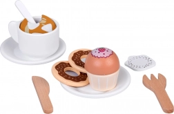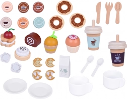 De uitgebreide accessoires omvatten kopjes met schoteltjes en lepeltjes, to-go bekers met deksels (Tea, Coffee), een melkpak, bestek, diverse taartjes, muffins, koekjes en chocolaatjes, en een eenvoudig menu. Alles is perfect afgestemd op kleine handjes en ondersteunt de fijne motoriek, oog-handcoördinatie en sociale vaardigheden.