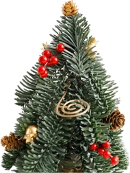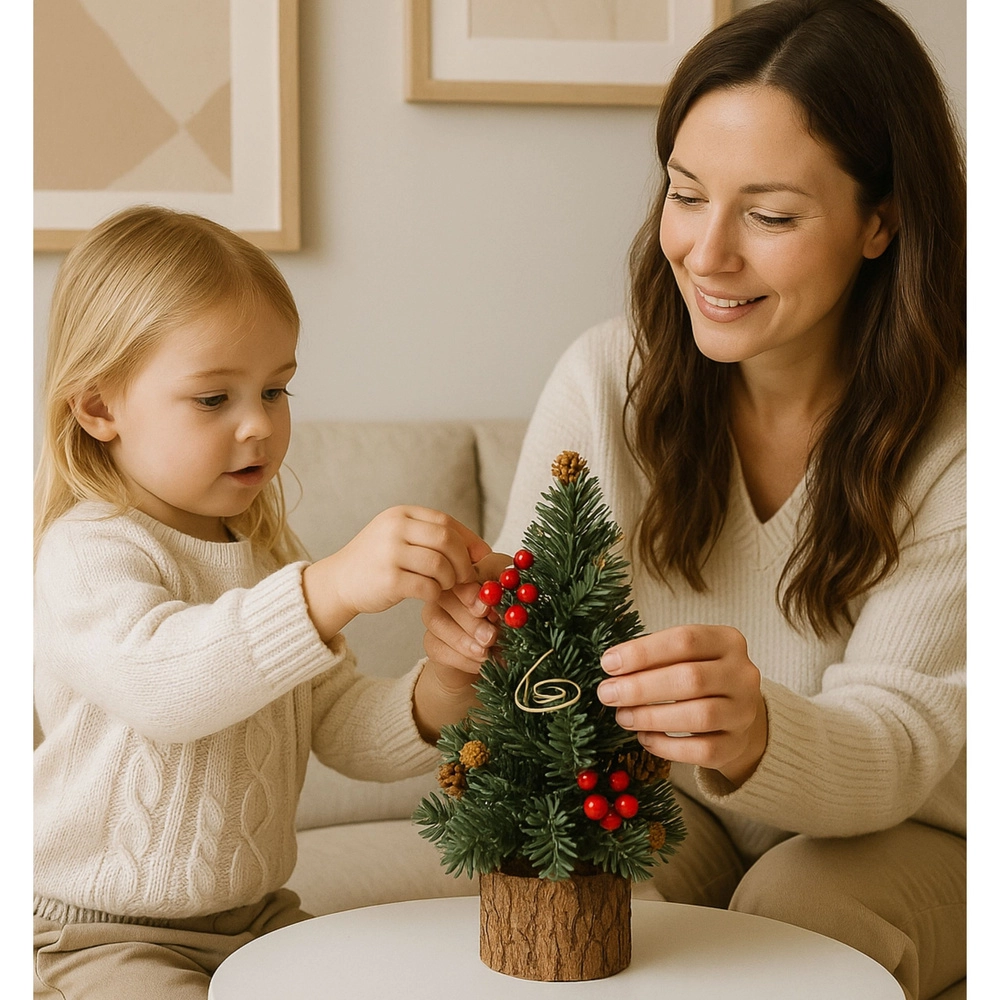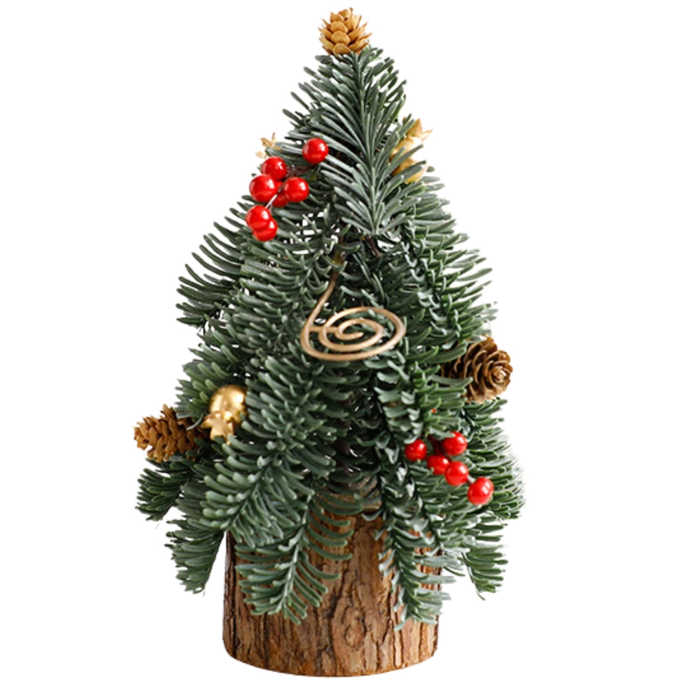 Compacte decoratieve kerstboom op een natuurlijke stam, met realistische naalden, rode bessen, dennenappels en gouden accenten. Dankzij de stabiele houten basis en de afmetingen 26 × 12 cm is het een ideale tafeldecoratie voor thuis, kantoor of winkel. Duurzame uitvoering voor vele seizoenen gebruik.