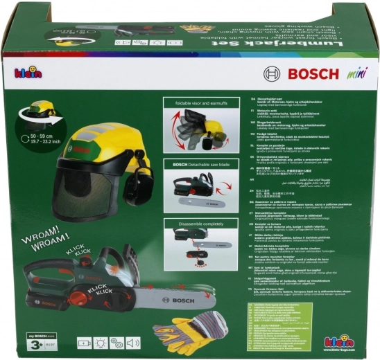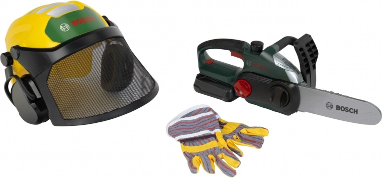 Met deze BOSCH kinderhoutkapset beleven kleine doe-het-zelvers realistisch speelplezier in een veilige uitvoering. De batterij-aangedreven kettingzaag biedt licht- en geluidseffecten, een verwisselbare “ketting”, en een ergonomische greep. De verstelbare bosbouwhelm met opklapbaar vizier en gehoorbeschermers en duurzame werkhandschoenen maken de uitrusting compleet voor leuk en leerzaam rollenspel.