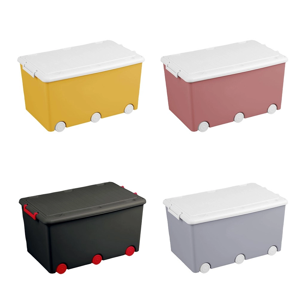 Ruim snel en eenvoudig de kinderkamer op met deze ruime speelgoedbox op wielen. Hij biedt een inhoud van 60 liter, afmetingen 57 × 36 × 29 cm en 6 wieltjes voor gemakkelijk verplaatsen. Dankzij de zijkantsluiting met 2 drukknopen berg je speelgoed, boeken en kleine spulletjes veilig op. De box is gemaakt van hoogwaardige gecertificeerde kunststof en is stapelbaar om ruimte te besparen.