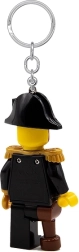 Gedetailleerde minifiguur met tricorne hoed, epauletten en piratenelementen, trouw aan de LEGO-stijl en opvallend aan sleutels en rugzak.