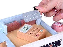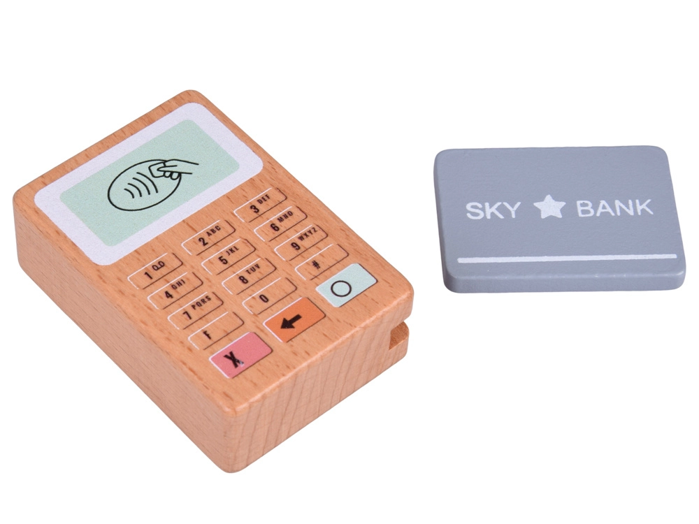 Inclusief houten betaalterminal en kaart voor contactloos “tappen”. Perfecte aanvulling voor rollenspel als verkoper en klant.