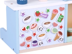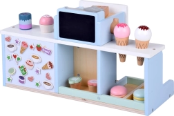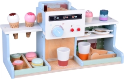 Deze houten café- en ijsbalieset met pastel design is ideaal voor kleine barista’s en patissiers. Kinderen kunnen koffie en thee bereiden en desserts serveren dankzij de draaiknoppen, knoppen, drankuitlaat en slimme plankjes en vakken voor de accessoires. Zorgvuldige afwerking van kwaliteits hout en niet-giftige verf garanderen lang en veilig speelplezier.