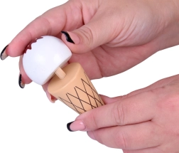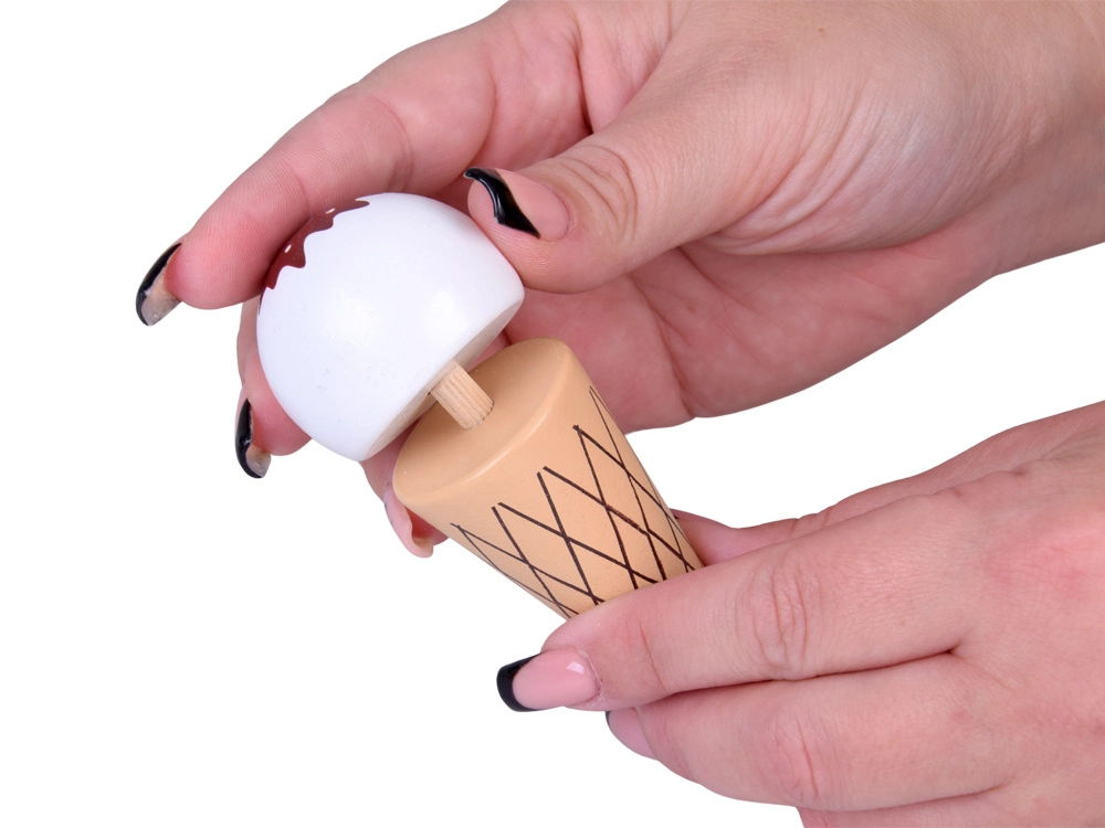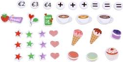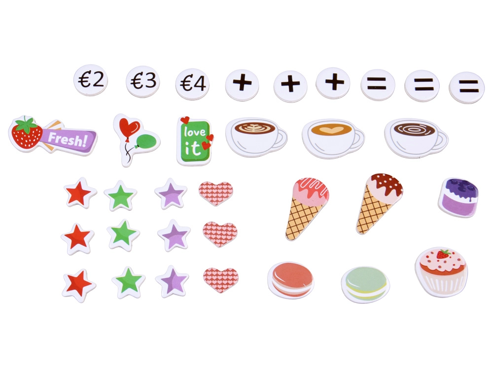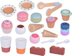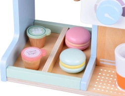 De set bevat een gevarieerd assortiment accessoires: bekers, bordjes, lepeltjes en tangetjes, houten ijsjes voor in hoorntjes, cupcakes, macarons en koekjes, verder melk en siroop, standaards om lekkernijen te presenteren en een betaalterminal met kaart voor kassa-rollenspel. Elk onderdeel is prettig glad en ligt goed in kleine handjes.