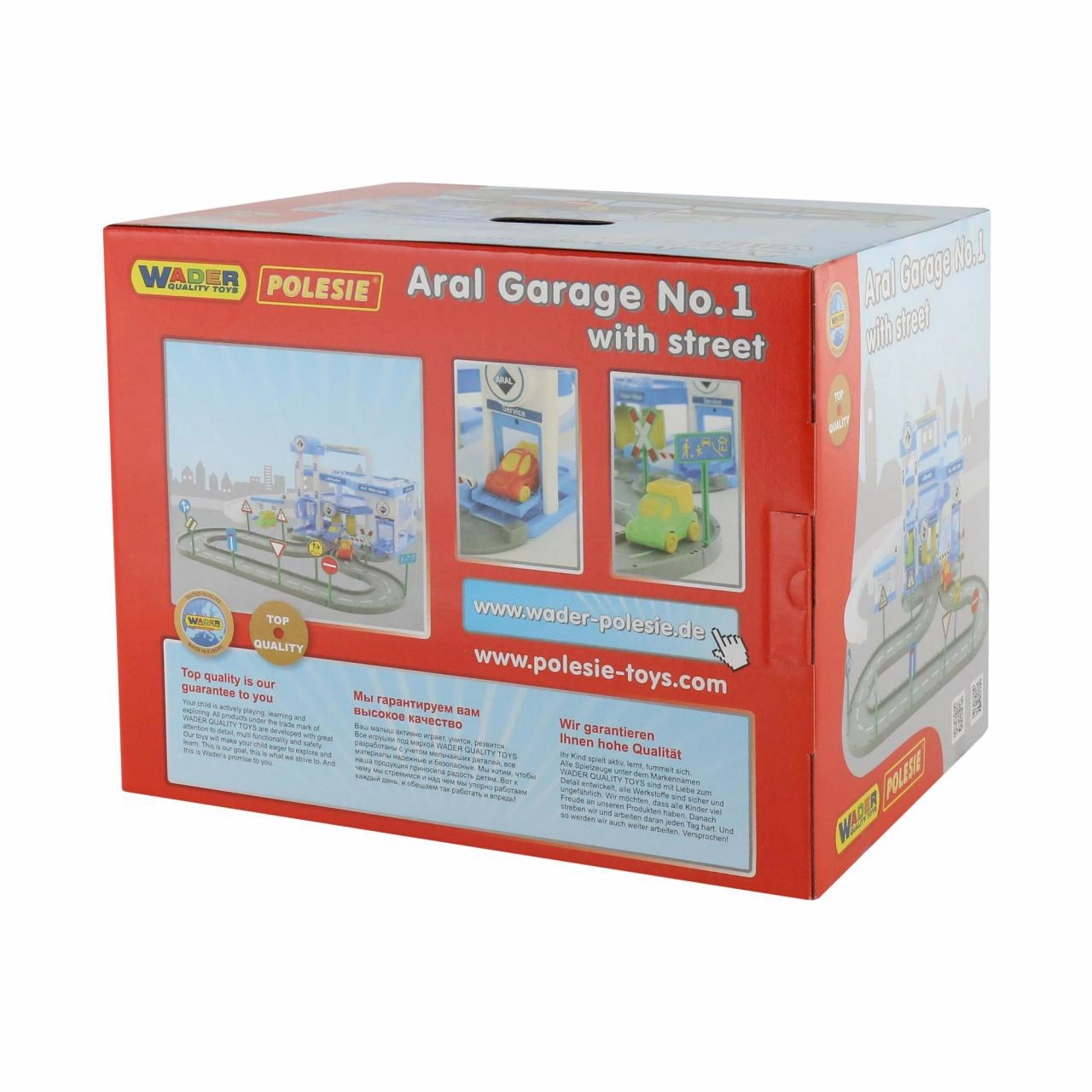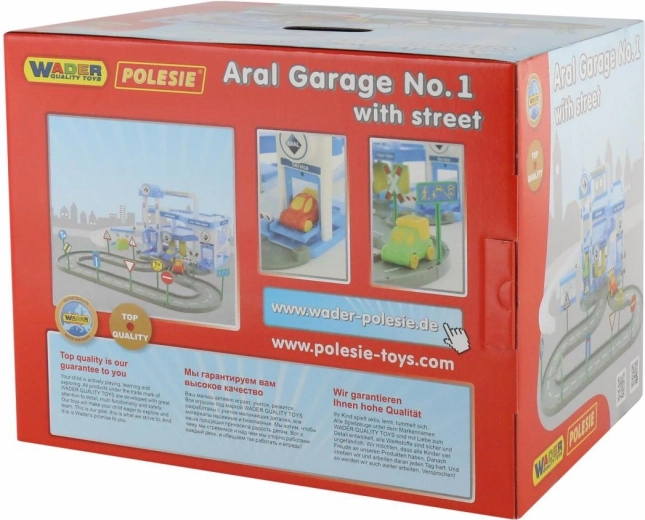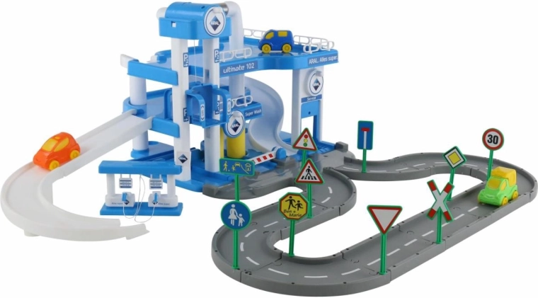 De ARAL kindergarage met drie verdiepingen zorgt voor uren speelplezier voor kleine autoliefhebbers. Hij biedt een mechanisch werkende lift, een service- en wasstation en wordt geleverd met 3 gekleurde autootjes. De hoge kwaliteit van Wader Quality Toys en de complete set stickers en verkeersborden garanderen een aantrekkelijke uitstraling en een lange levensduur.