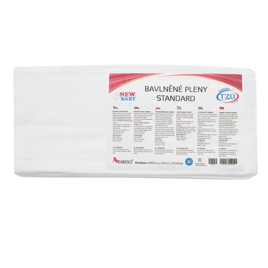 De katoenen luiers NEW BABY van standaardkwaliteit zijn een betrouwbare keuze voor elke uitzet. De zachte en ademende 100% katoenen stof is vriendelijk voor de gevoelige babyhuid, neemt goed vocht op en droogt snel. Dankzij het universele formaat van 60 × 80 cm kun je ze gebruiken als traditionele luier, als onderlegger, doek of lichte deken.