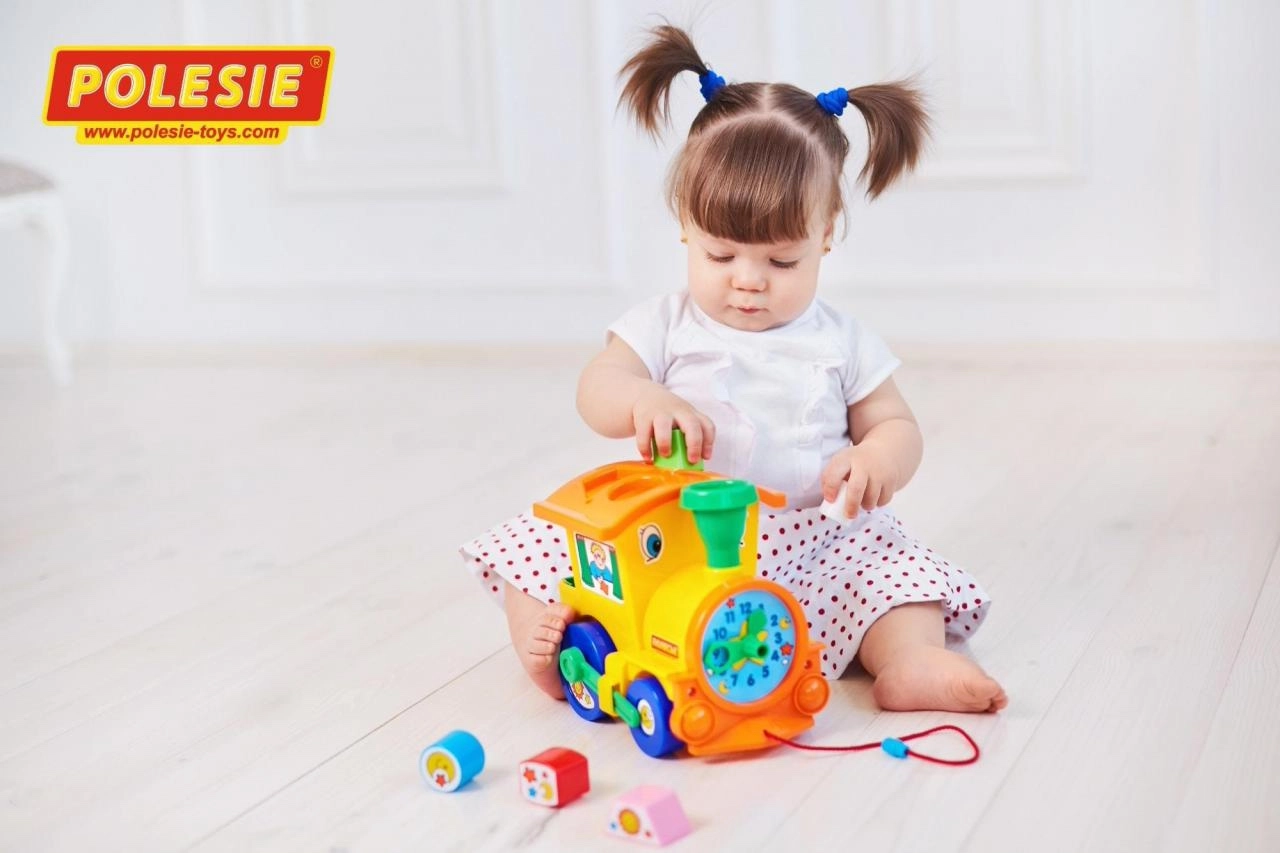 De locomotief is gemaakt van duurzaam plastic, heeft gladde randen en prettige kleuren. Het kind kan het treintje gemakkelijk aan het koord trekken en de vormen in de juiste openingen plaatsen. De klok met wijzers ondersteunt op speelse wijze de basisoriëntatie in tijd.