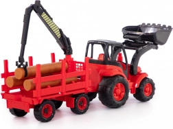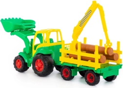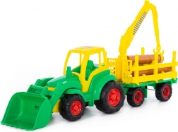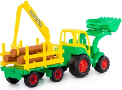 Deze kleurrijke tractor met grote wielen en aanhanger voor boomstammen is ideaal voor creatief spel thuis en op de speelplaats. Kinderen kunnen met de beweegbare voorste schep materiaal opscheppen en met de kraan met grijper op de aanhanger houten stammen verplaatsen en laden. De duurzame kunststof constructie zorgt voor een lange levensduur en veilig spelen.
