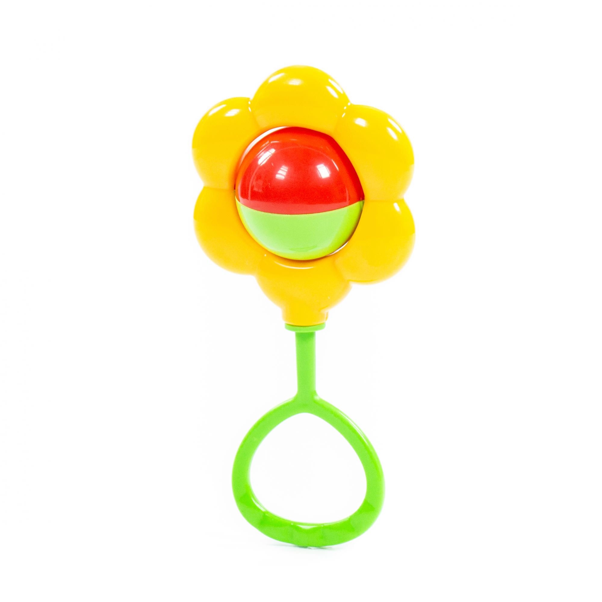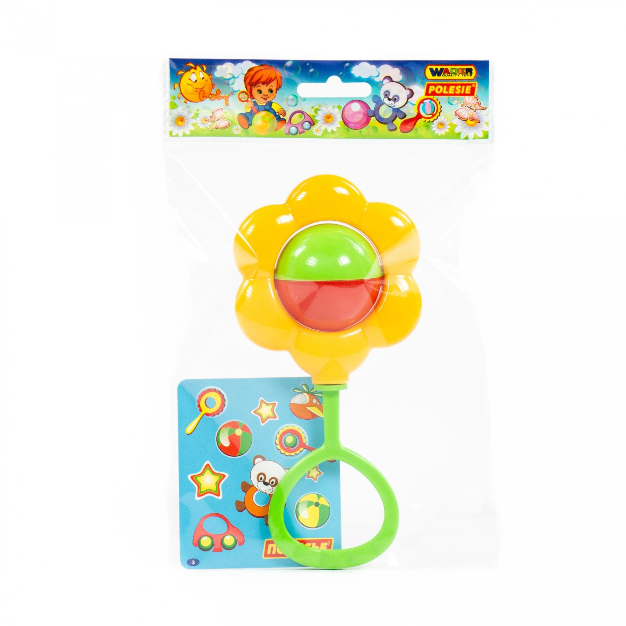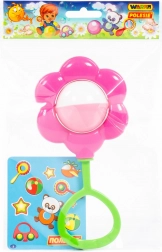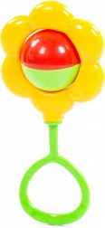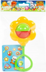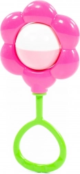 Lichte kunststof rammelaar in de vorm van een bloem voor de allerkleinsten. Veilig, gecertificeerd materiaal, een comfortabel greep-oog voor kleine handjes en zacht gerammel voor zintuiglijke stimulatie. Kleur volgens de actuele aanbieding. Prijs per stuk.