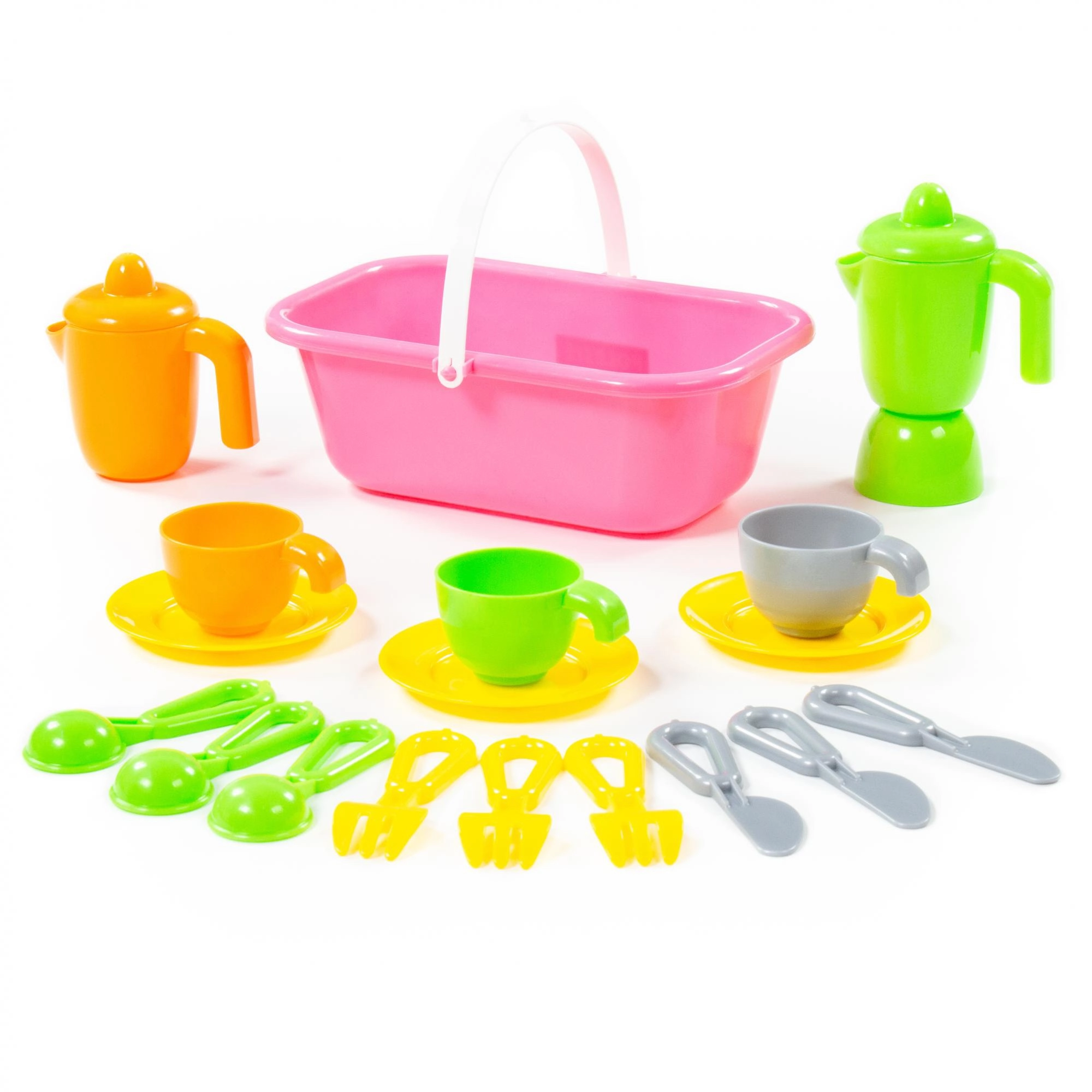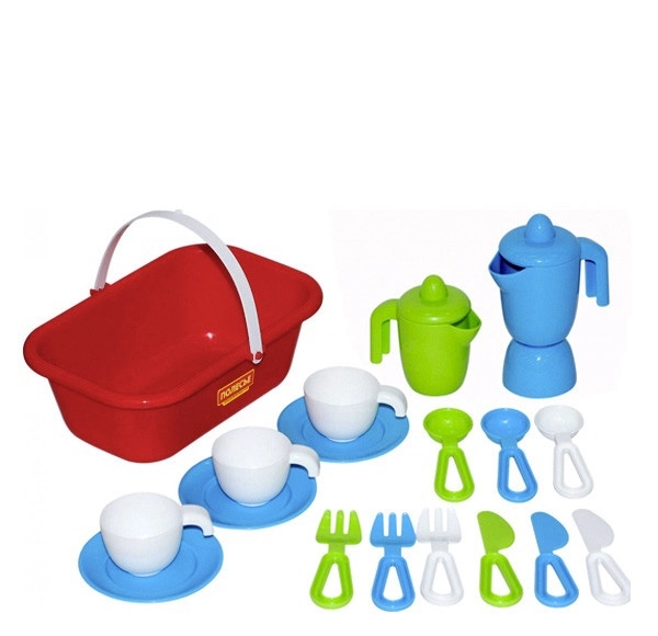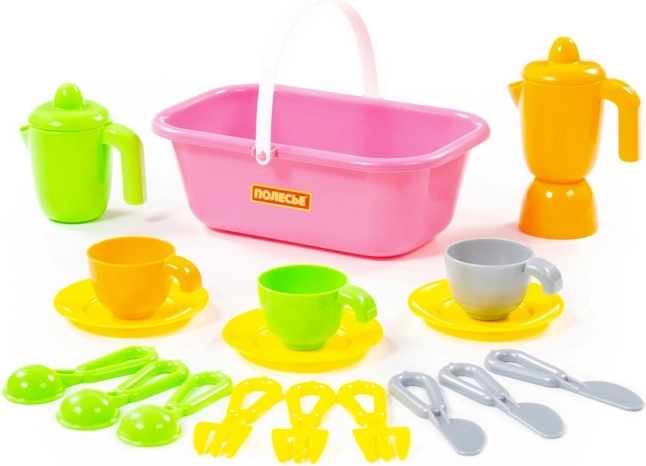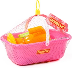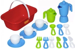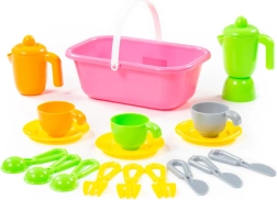 Stijlvolle kinderserviesset Top Chef met mandje voor 3 personen brengt alles wat kleine koks nodig hebben voor rollenspel koken. Bevat 18 onderdelen, is gemaakt van hoogwaardige en veilige materialen van het merk Wader-Polesie Toys en is ideaal voor speelkeukens thuis en samen spelen. Kleurencombinaties kunnen variëren afhankelijk van de actuele beschikbaarheid.