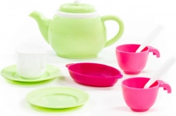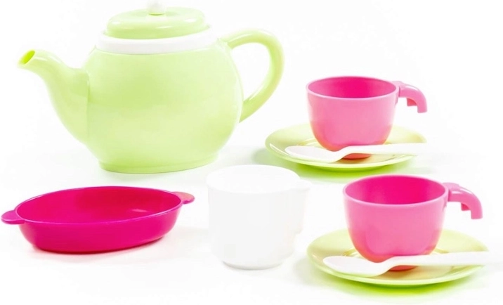 Complete set met theepotje, kopjes, schoteltjes en lepeltjes waarmee kinderen volwassenen kunnen nadoen en uitgebreide theefeestjes kunnen organiseren.