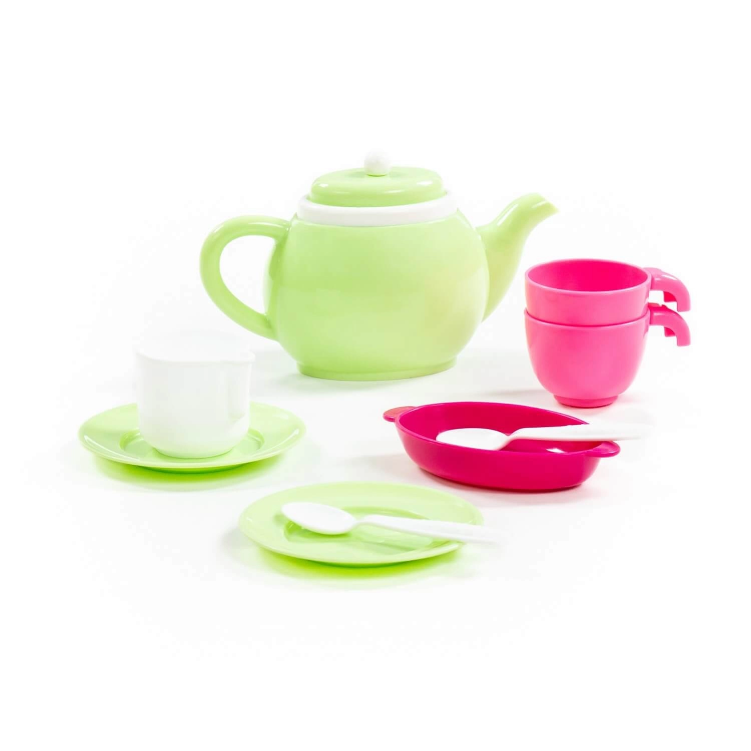De set bevat een theepotje met deksel, bekers, schoteltjes, lepeltjes en een serveerblad/kommetje. Dankzij de contrasterende kleuren is hij visueel aantrekkelijk voor kinderen en ondersteunt hij hun zintuiglijke ontwikkeling.