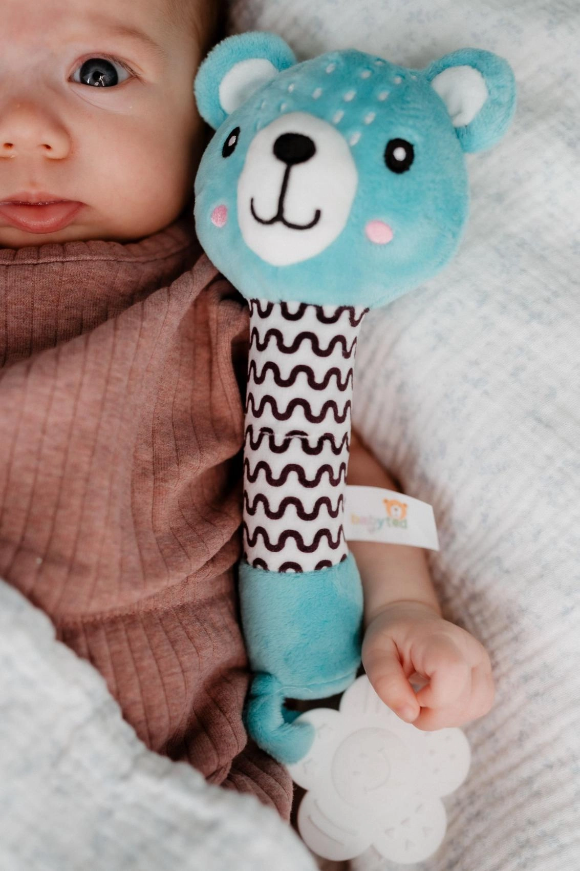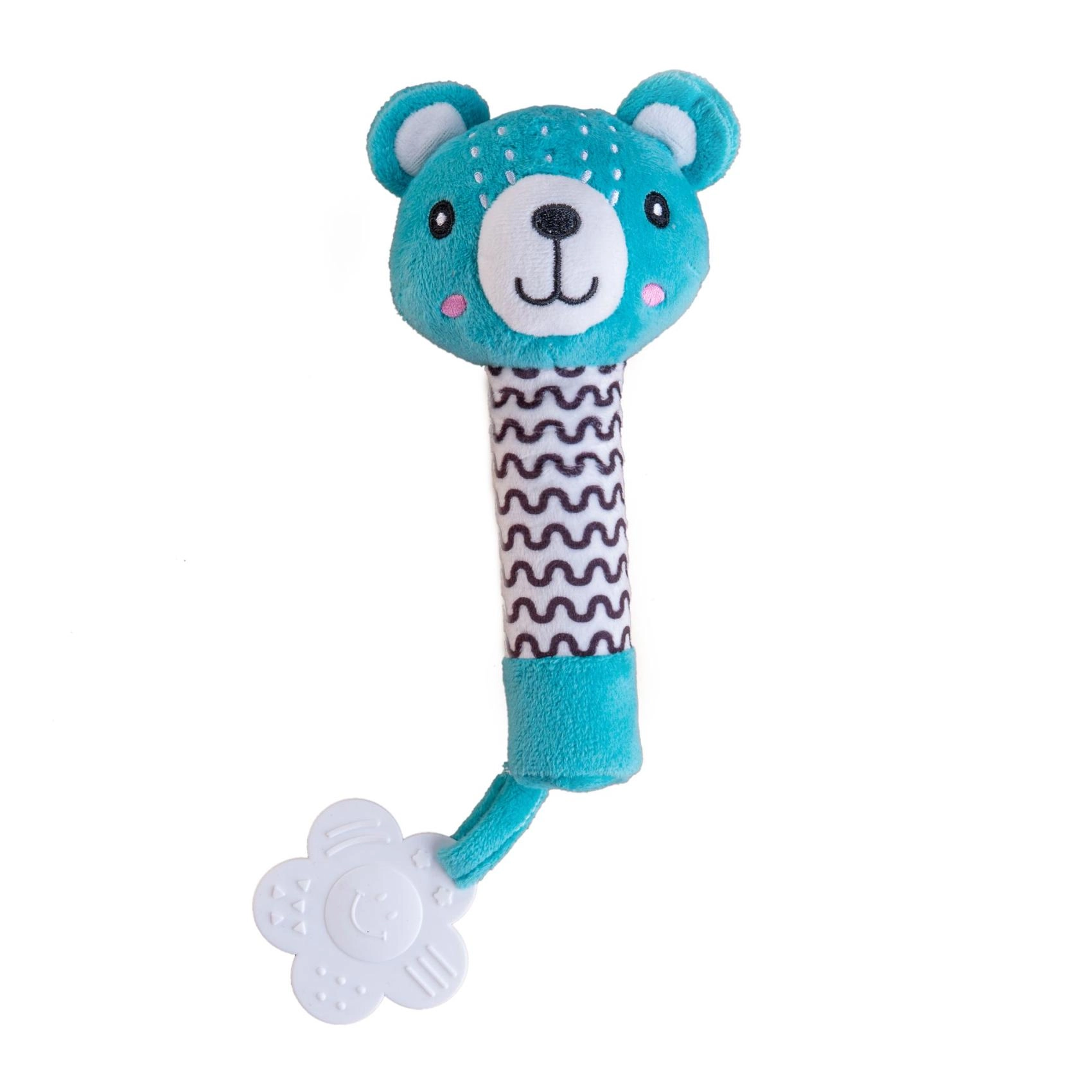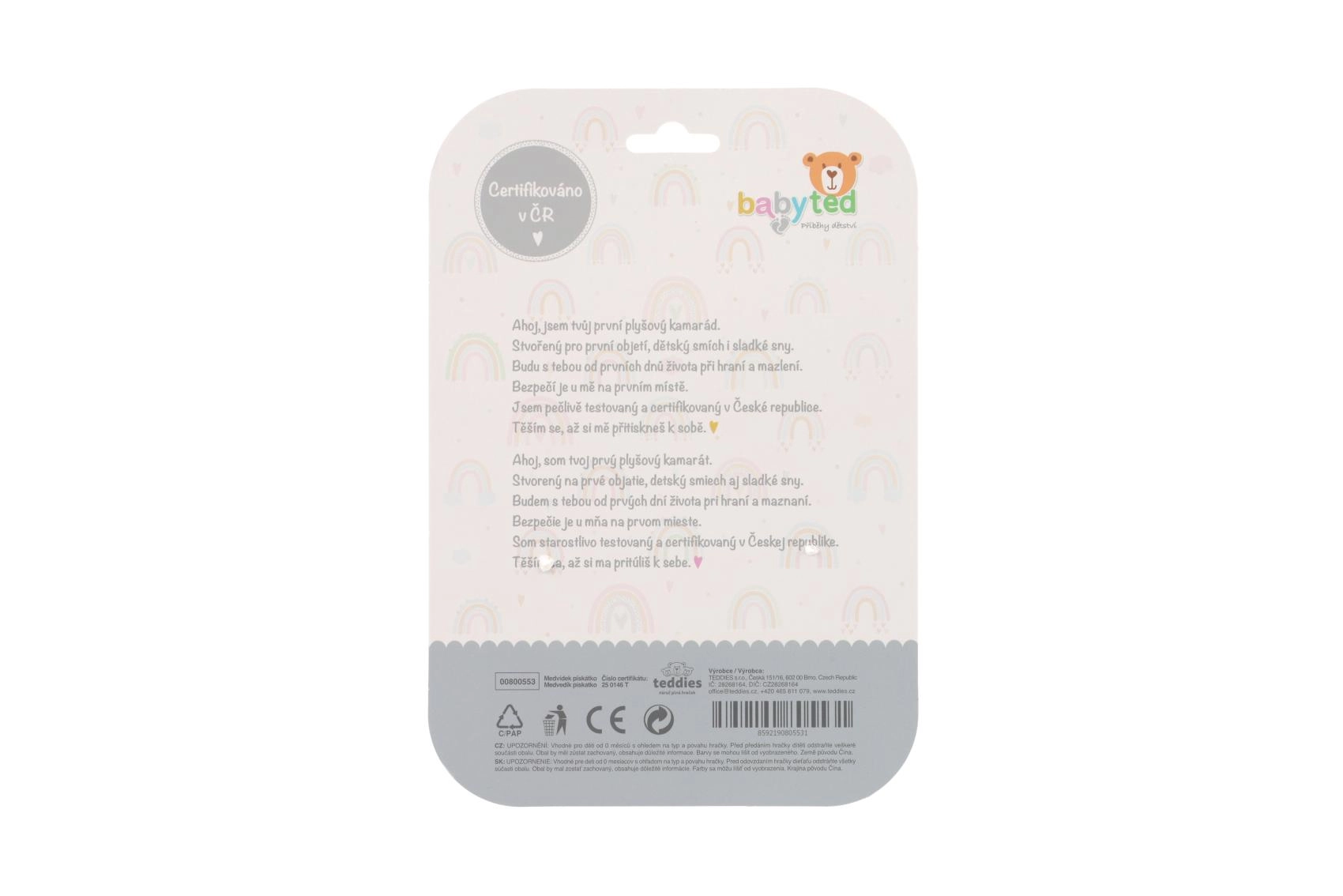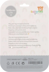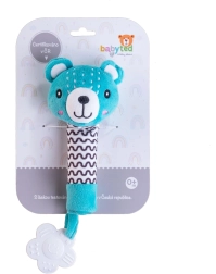 De schattige pluchen rammelaar met beertje van BABYTED is het ideale eerste speeltje voor baby’s vanaf 0 m+. Dankzij de lange, zachte handgreep ligt hij goed in kleine handjes, bij indrukken piept hij zacht en stimuleert zo het gehoor. Aan het uiteinde zit een zachte bijtring in de vorm van een bloemetje die verlichting biedt voor gevoelige tandvlees. Zachte, veilige pluche en contrasterende patronen ondersteunen het zicht en de sensorische ontwikkeling. Het speeltje is gecertificeerd in Tsjechië en voldoet aan strenge veiligheidsnormen.