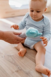 Bij indrukken geeft het speeltje een rustgevend piepgeluid dat op natuurlijke wijze de aandacht van de baby trekt en de ontwikkeling van het gehoor stimuleert.