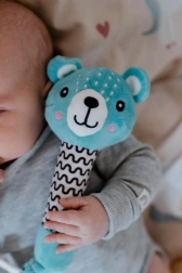 Deze superzachte rammelaar met bijtring in de vorm van een beertje biedt baby’s zowel rust als plezier in één. Het lange, smalle handvat is makkelijk vast te pakken, het zachte piepgeluid prikkelt het gehoor en de bloemetjes-bijtring helpt bij het doorkomen van de eerste tandjes. De zachte pluche voelt aangenaam aan en is al geschikt vanaf de geboorte.