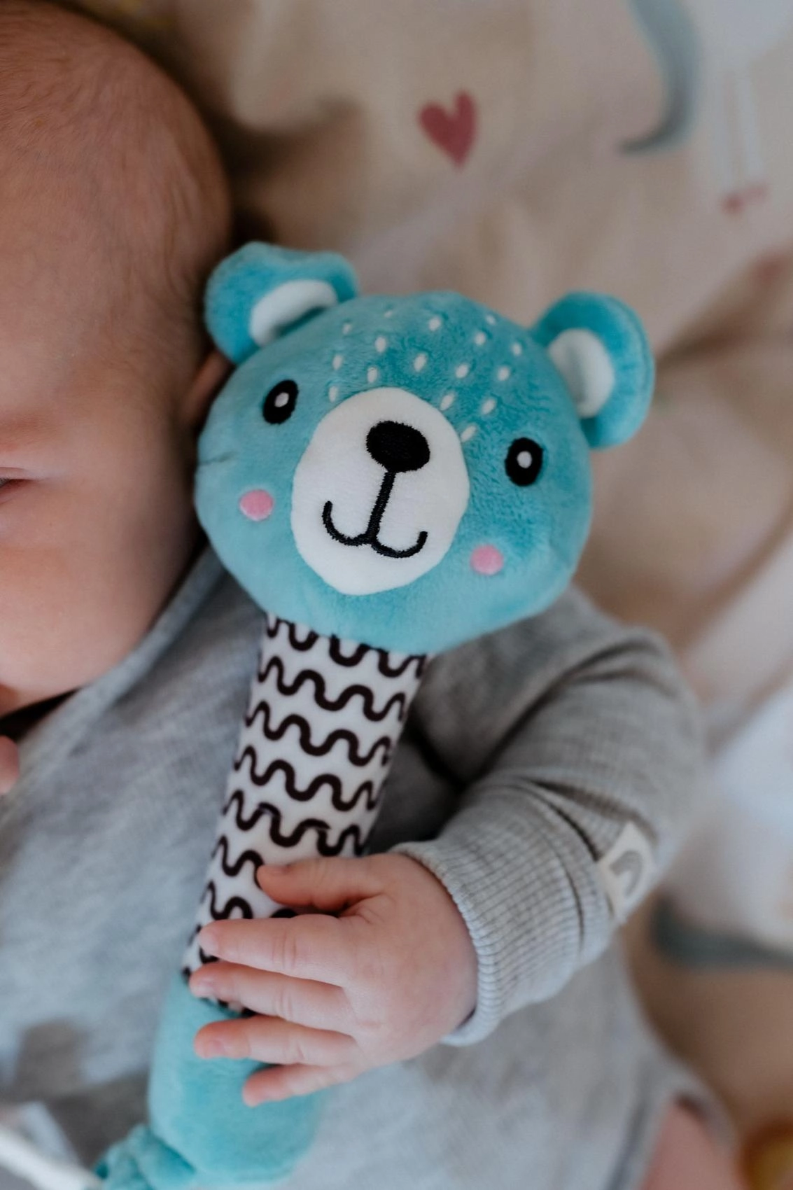 Het smalle, lange handvat met contrasterend patroon is gemakkelijk vast te houden, zelfs voor de kleinste handjes. De zachte, veilige pluche voelt prettig aan en is geschikt vanaf de geboorte.