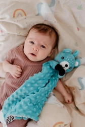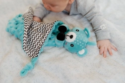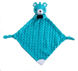Een superzacht knuffeldoekje met het hoofdje van een schattige beer van zachte minky met 3D-stipjes geeft je baby een gevoel van veiligheid, rust bij het inslapen en zachte sensorische stimulatie. In het beertje zit een zacht rammelaartje ter ondersteuning van het gehoor en in de hoek een zachte siliconen bijtring die verlichting biedt bij doorkomende tandjes.