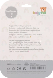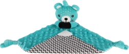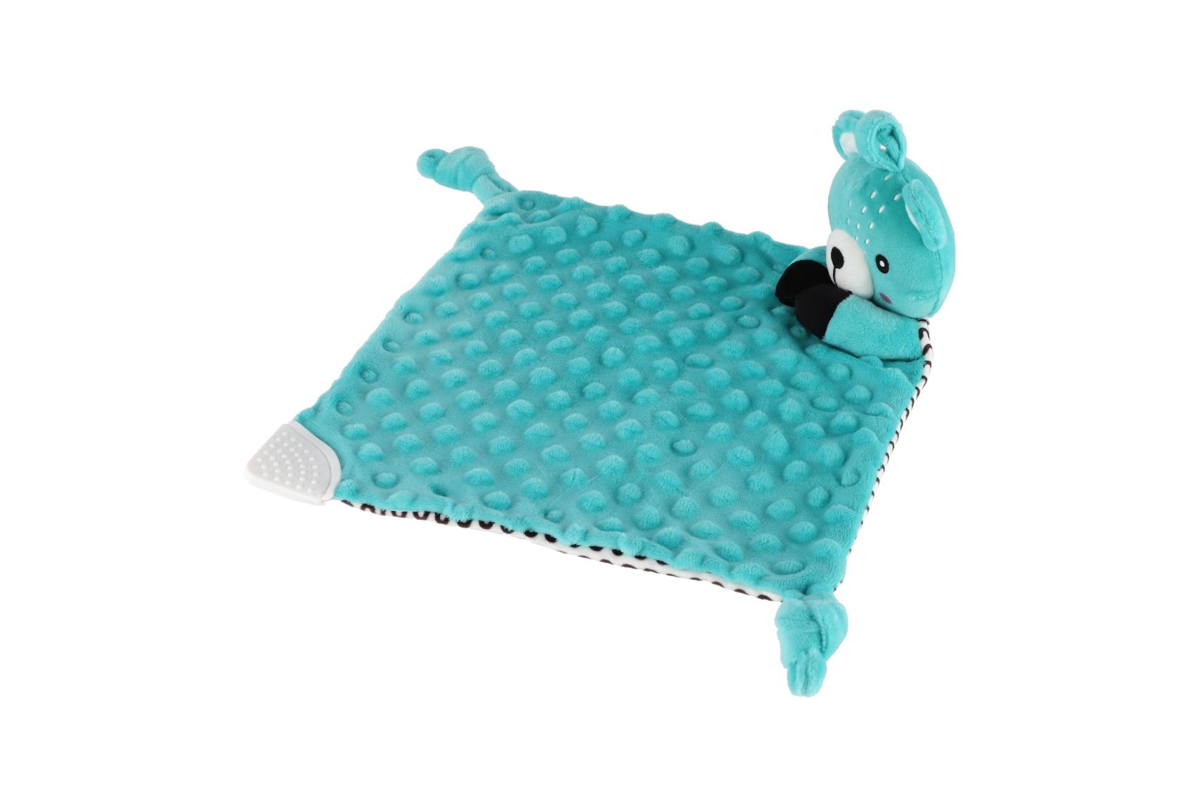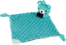 Een van de hoeken van het doekje is voorzien van een zachte siliconen bijtring die verlichting geeft aan gevoelig tandvlees. Knoopjes in de hoeken zijn makkelijk vast te pakken voor kleine handjes en ondersteunen de ontwikkeling van de fijne motoriek. Het product is gecertificeerd in Tsjechië en voldoet aan de veiligheidsnormen voor pasgeborenen.
