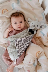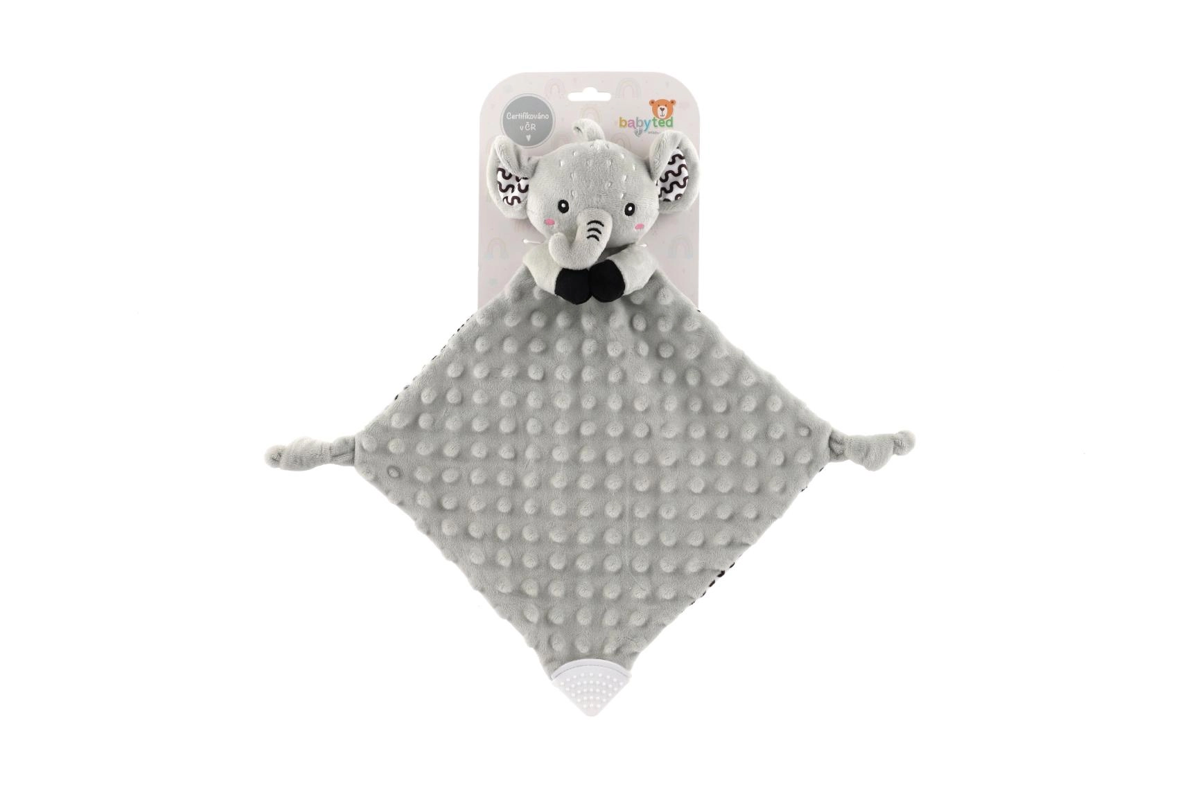 Een superzacht knuffeldoekje in de vorm van een olifant van BABYTED geeft je baby een gevoel van veiligheid en helpt bij een rustige slaap. De zachte minky-stof met 3D stipjes nodigt uit om te knuffelen, de verborgen zachte rammelaar stimuleert het gehoor en de zachte siliconen bijtring verlicht bij doorkomende tandjes. Geschikt vanaf de geboorte, gecertificeerd in Tsjechië.