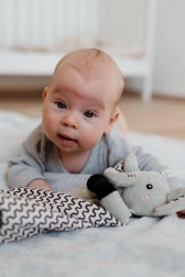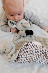 De geïntegreerde rammelaar klinkt zachtjes en ondersteunt de gehoorontwikkeling, terwijl de zachte siliconen bijtring verlichting biedt aan gevoelig tandvlees bij de eerste tandjes. Het doekje is ideaal voor het slapen, in de kinderwagen en op reis.
