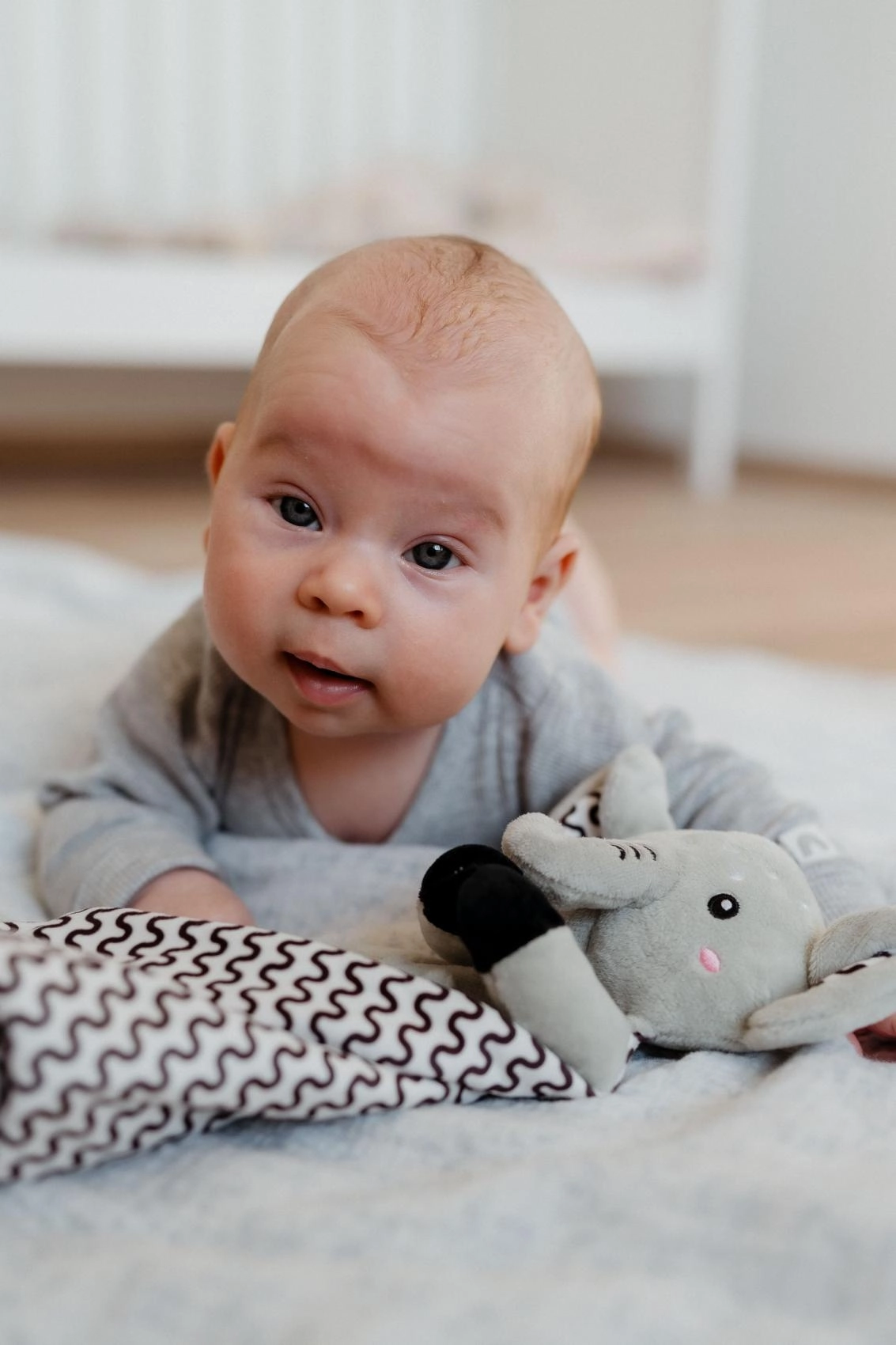 De discreet verborgen zachte rammelaar ondersteunt de gehoorontwikkeling en boeit je kleintje zonder storend lawaai.