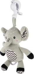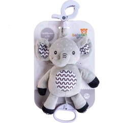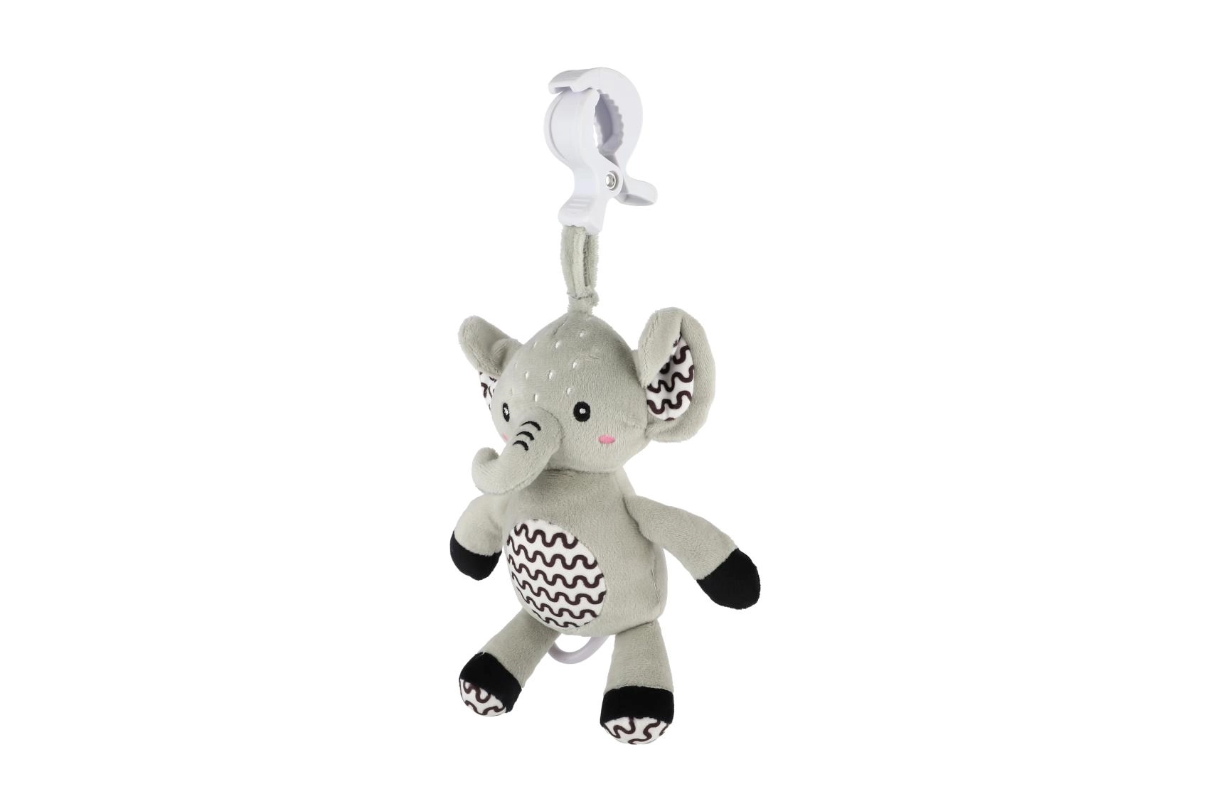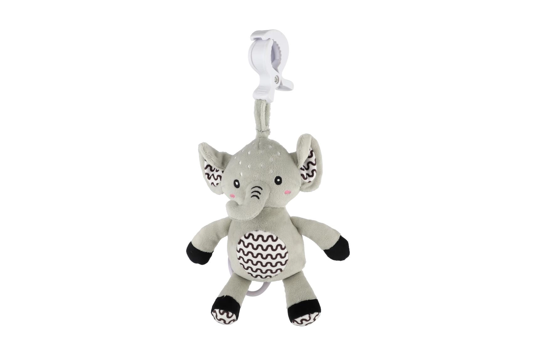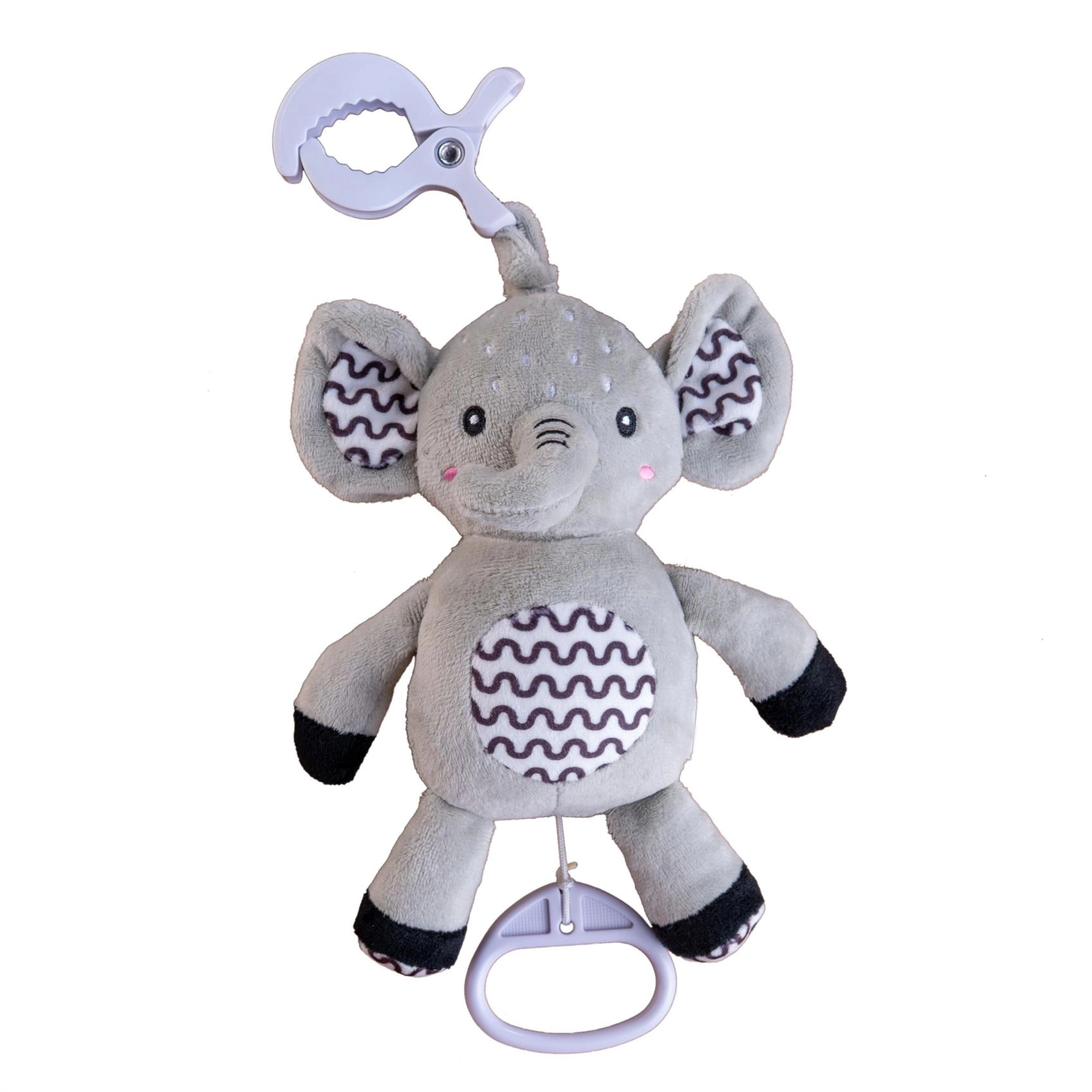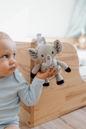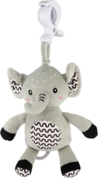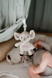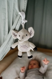 Deze superzachte olifant is een ideaal eerste speeltje voor je baby. Na het trekken aan de ring klinkt een zachte, kalmerende melodie die helpt te ontspannen en makkelijker in slaap te vallen. Met de duurzame ophangclip bevestig je hem aan het ledikant, de kinderwagen, het autostoeltje of de speelboog – zo heeft je kleintje zijn vriendje altijd bij zich.