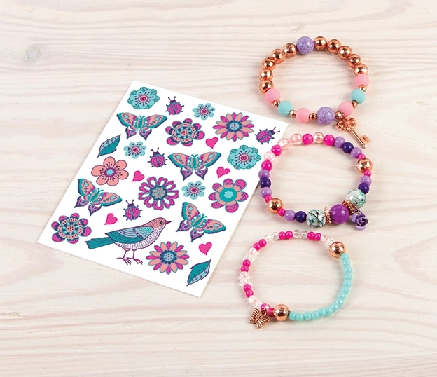 Ontwikkel je creativiteit en ontwerp je eigen bloemenarmbanden die je combineert met tijdelijke tatoeages. Dankzij de kleurrijke kralen, bedels en het eenvoudige rijgen maak je in een handomdraai sieraden waar elke kleine fashionista blij van wordt.
