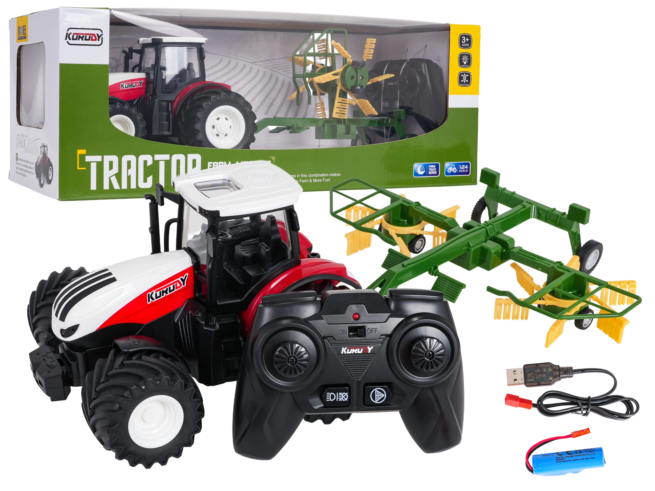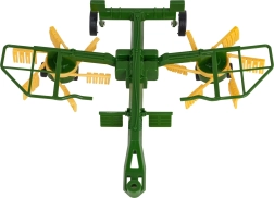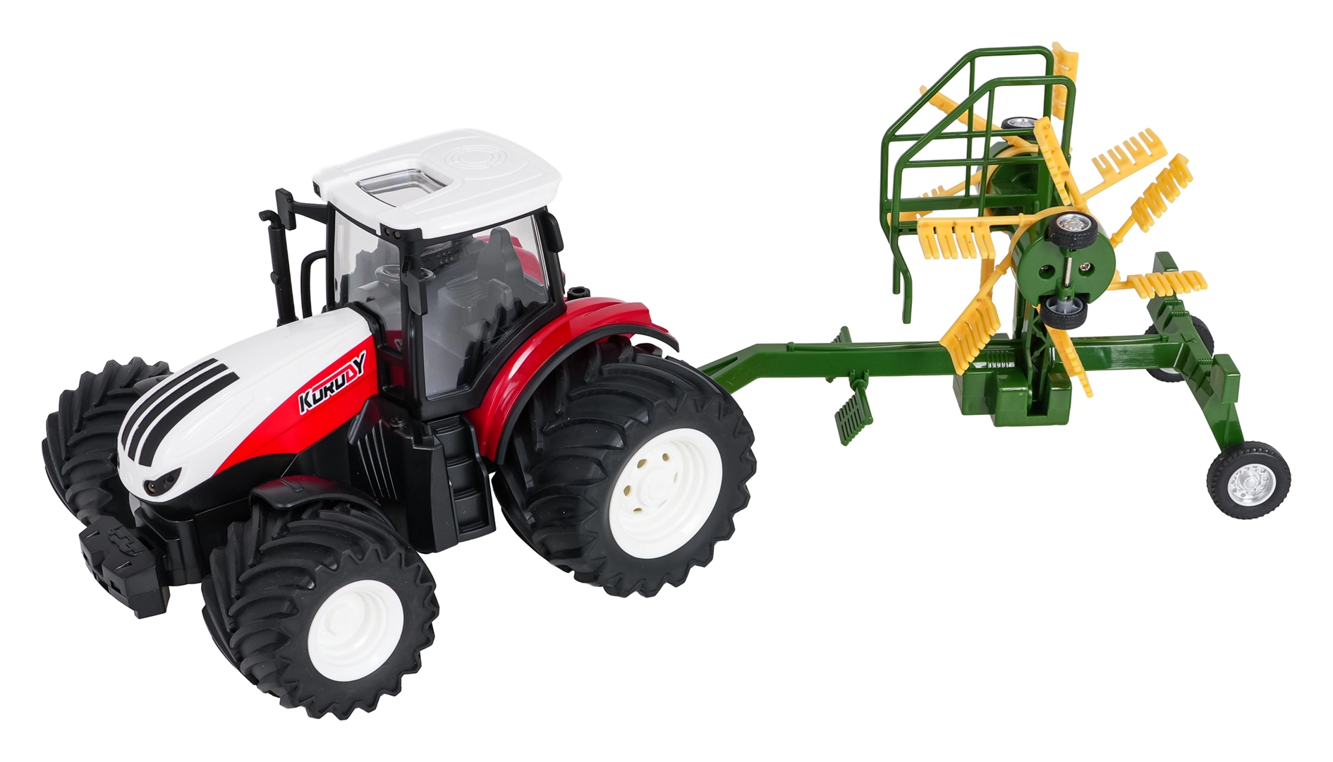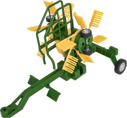 Onderdeel is een gedetailleerde twee-rotor hooihark: je koppelt hem eenvoudig los, klapt hem zijwaarts neer en laat de rotoren handmatig draaien – ideaal voor fantasierijk boerderijspel. De voeding wordt geleverd door een oplaadbare accu van 3,7 V 500 mAh (meegeleverd); sluit gewoon de USB-kabel aan en het speelplezier kan doorgaan.