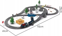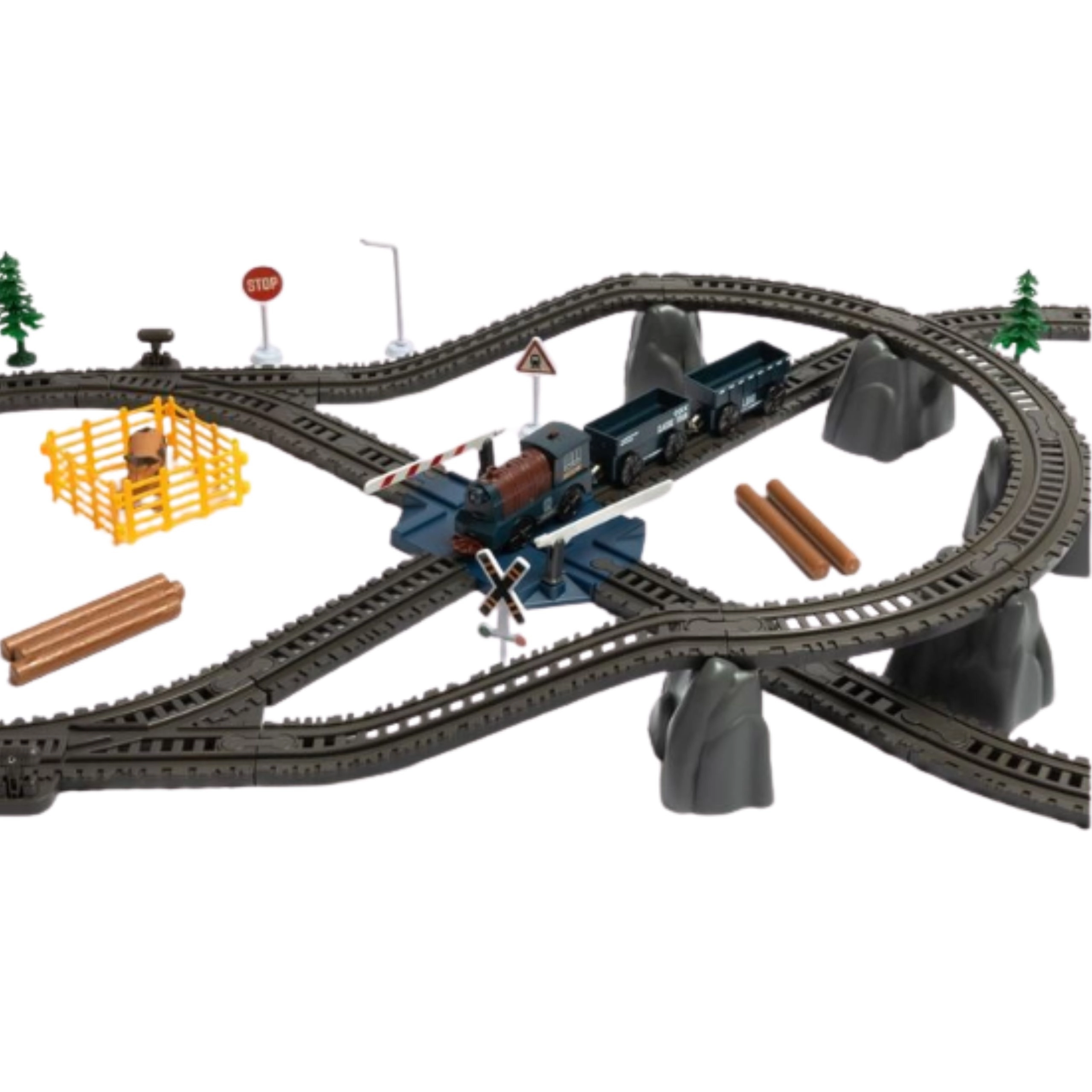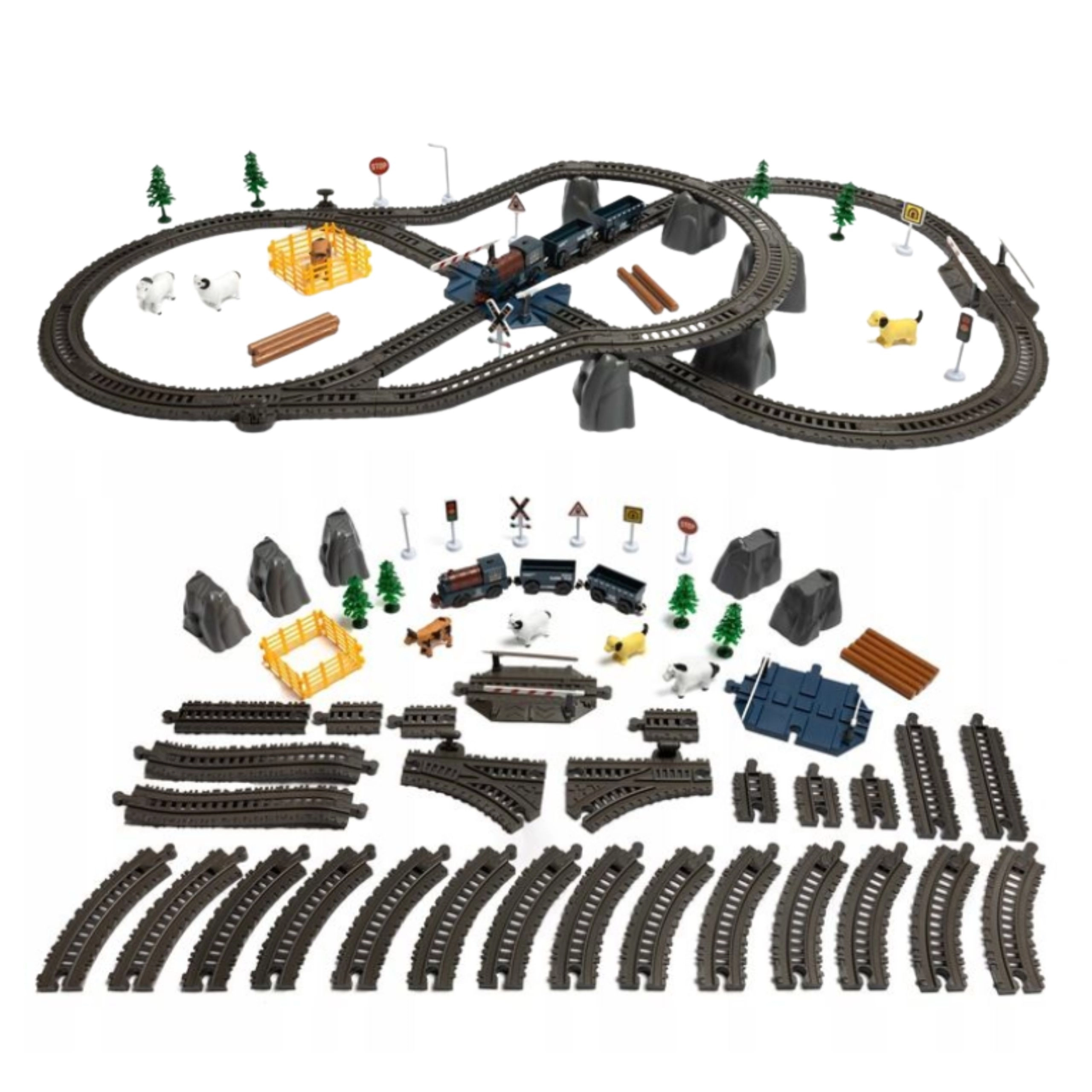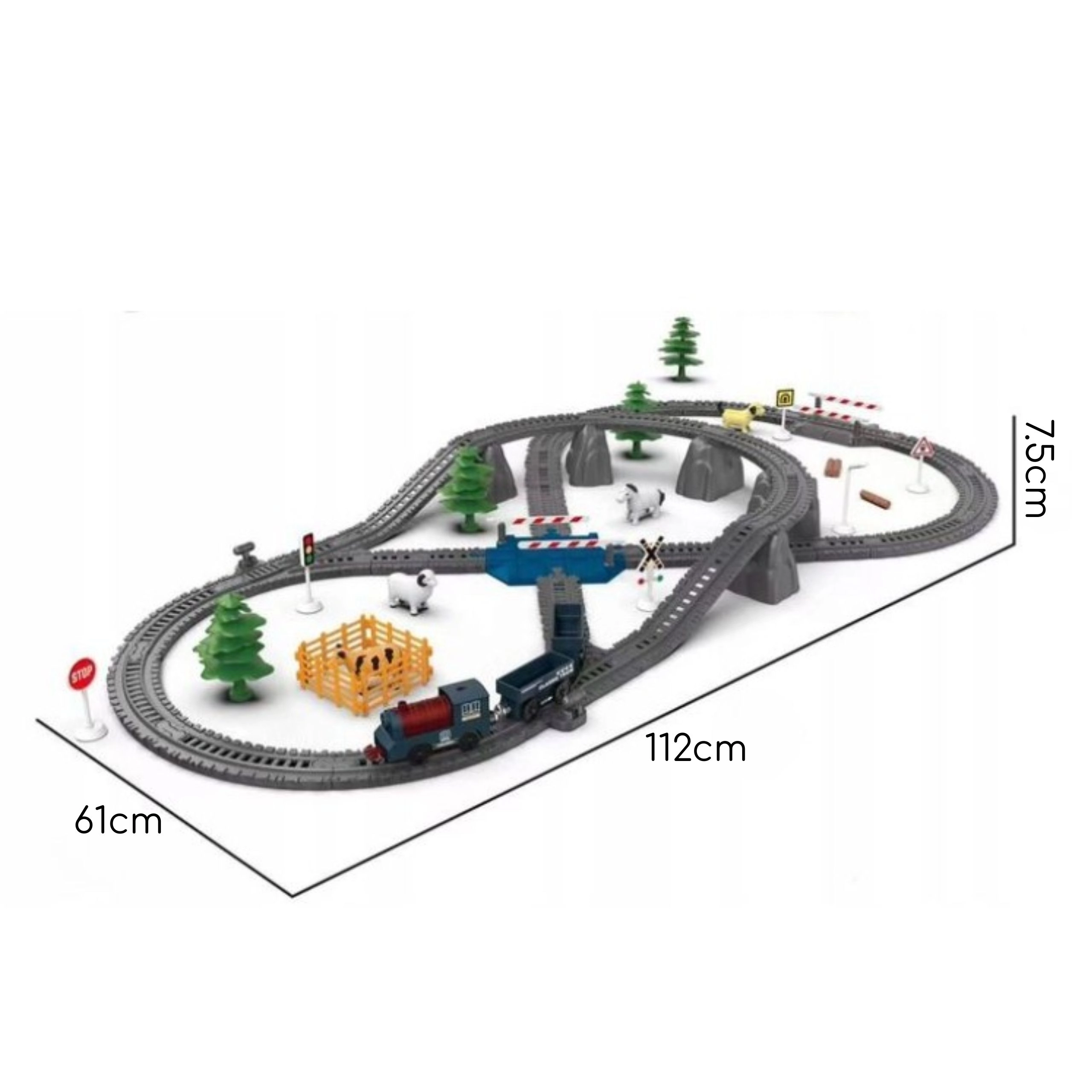 Lange kunststof rails met wissels, lussen en overwegen maken het mogelijk om eenvoudige rondes en complexe spoornetwerken te bouwen.