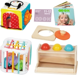 De Montessori box 5-in-1 biedt doordachte activiteiten voor het dagelijks ontdekken van de wereld. Kinderen genieten van een elastische sensorische kubus met kleurrijke blokken, houten boxen met balletjes voor het trainen van objectpermanentie, een spiegel ter ondersteuning van zelfbewustzijn en makkelijk vast te pakken manipuleeronderdelen. De set is ontworpen om op natuurlijke wijze fijne motoriek, aandacht en verbeelding te versterken.