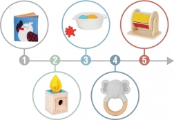 Alle onderdelen zijn ontworpen voor kleine kinderhandjes: een zacht stoffen boekje voor de eerste bladzijdes, magische doosjes met sjaaltjes voor eindeloze ontdekking, een veilige siliconen bijtring ter verlichting bij doorkomende tandjes, sensorische ballen met verschillende texturen voor tactiele prikkels en een draaiende trommel met kleuren en spiegeltje voor visuele fascinatie.