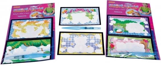 De doos bevat twee afbeeldingen met verschillende motieven en een magische penseel die je alleen maar met water hoeft te vullen, en de afbeelding is klaar om te verven. Zodra de afbeelding droogt, verschijnt de witte laag opnieuw en kunnen kinderen opnieuw beginnen met creëren.