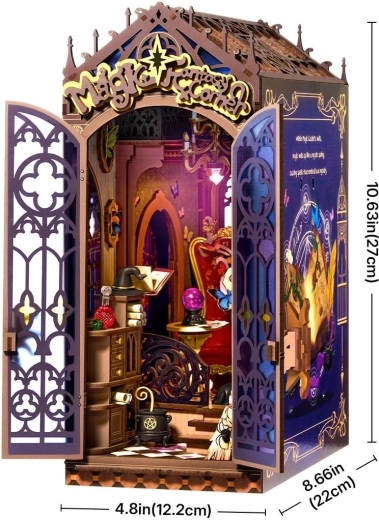 De set is gemaakt van hoogwaardige, veilige en niet-giftige materialen. Dankzij het doordachte ontwerp werkt het model zowel als boekensteun als zelfstandige kastdecoratie. De LED-verlichting zorgt ’s avonds voor een knusse, mysterieuze sfeer en accentueert elk miniatuurdetaill.
