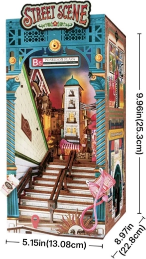Deze DIY-set uit de ROLIFE Book Nook-serie verandert je boekenkast in een schilderachtig stadssteegje. Het bovenste deel van de scène biedt een straatniveauzicht – met lampen, borden, bestrating en lichtgevende ramen. Beneden bij de trap vind je kleine rekwisieten uit het stadsleven, zoals een papieren koffiebeker of een roze handtas, en voor reisliefhebbers een zon- en kaartpinmotief. In de plank geschoven verrast een slim element: onder de trap zit een mini-station dat zichtbaar wordt zodra je hem uitschuift.