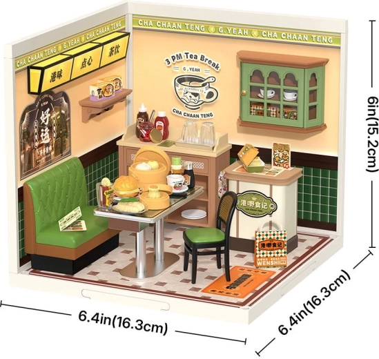 Ontdek de charme van een traditionele Hongkongse cafetaria in miniatuur met het model Rolife doe-het-zelf poppenhuis: Hongkongse cafetaria. De set met 114 stukjes en LED-verlichting biedt eenvoudige montage (moeilijkheid 1/5) in ongeveer 1 uur en bevat authentieke details zoals een groene leren bank, een serveerwagen en iconische lekkernijen waaronder dimsum, ananasbroodjes en melkthee.