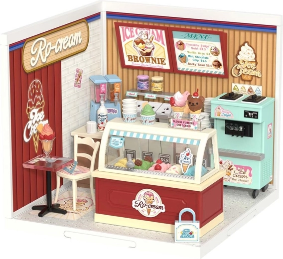 Bouw je eigen retro ijssalon met zachte pasteltinten en functionele LED-verlichting. Deze miniatuur DIY-set van ROLIFE biedt snel in elkaar te zetten onderdelen met lage moeilijkheidsgraad, leuke decoraties en realistische elementen – van de toonbank met bakken tot de softijsmachine. Ideaal als cadeau en als stijlvolle decoratie voor het interieur.