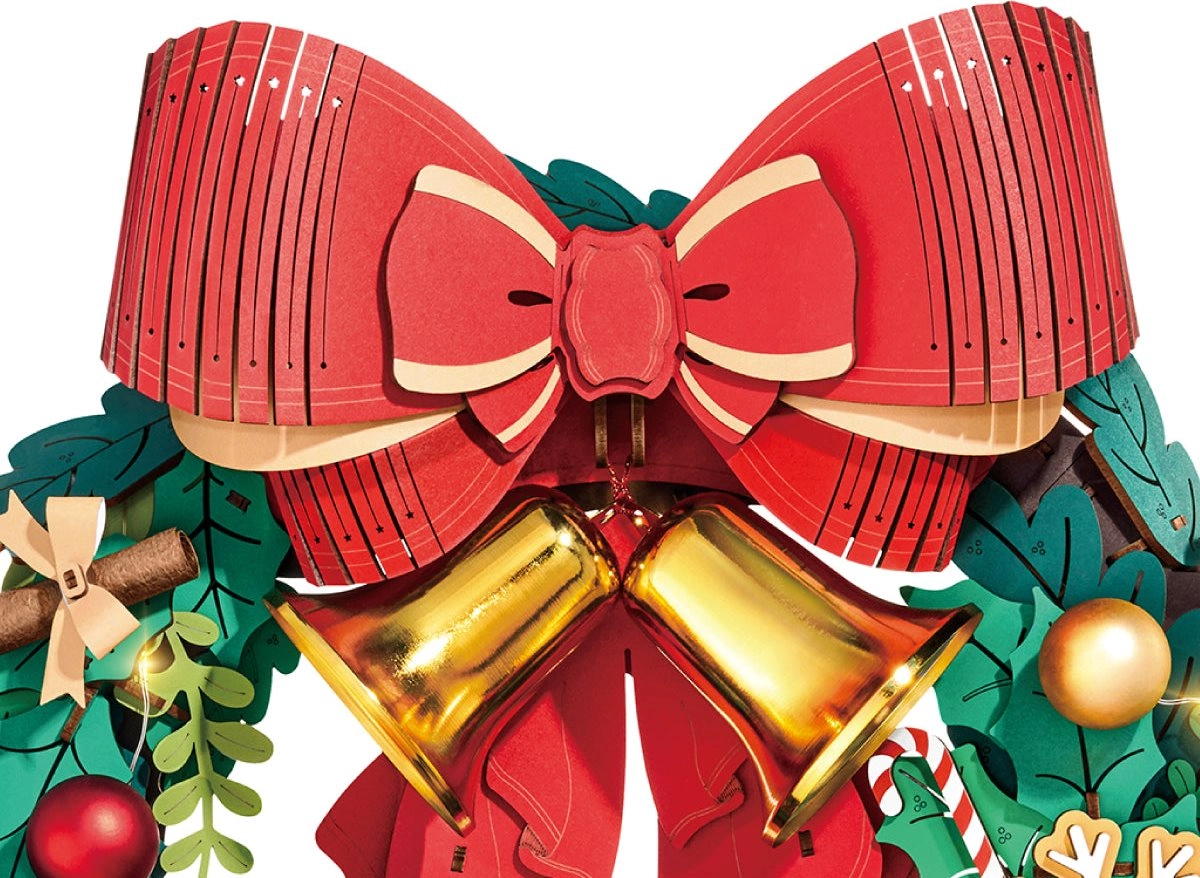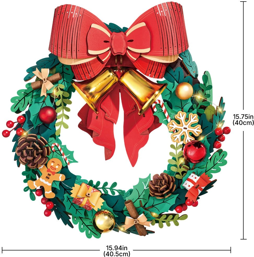 Deze elegante kerstkrans combineert traditionele motieven met modern DIY-plezier. Groene takjes worden aangevuld met decoraties zoals hulst, bessen, dennenappels, sneeuwvlokken, een peperkoekmannetje, cadeautjes en de iconische grote rode strik met gouden belletjes. Geïntegreerde LED’s versterken de feestelijke sfeer en maken van het voltooide model een unieke decoratie voor deur of muur.