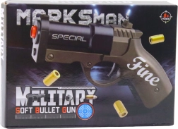 De mini pistool MARKSMAN FINE in bruin‑zwarte uitvoering is ideaal voor actievol kinderspel, binnen en buiten. Duurzaam kunststof, compacte afmetingen van 13,5 cm en eenvoudige bediening maken hem tot een geweldige partner voor de ontwikkeling van coördinatie, reflexen en behendigheid.