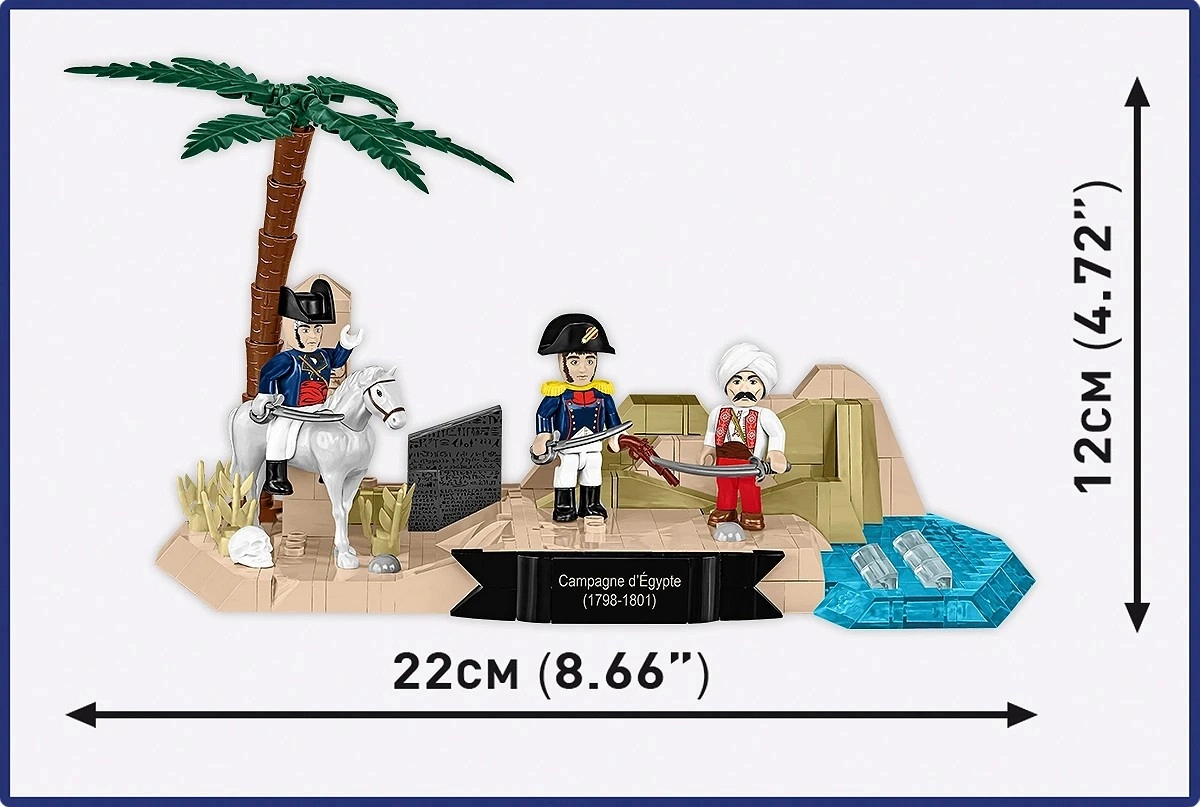 Ontdek een exotisch hoofdstuk uit de Napoleontische geschiedenis met de COBI Campagne d’Égypte (1798–1801). Bouw een mini-diorama met woestijn, palm en de Steen van Rosetta, aangevuld met gedetailleerde minifiguren van Franse officieren en een mameluk te paard. Alle elementen hebben kwalitatieve prints zonder stickers, een intuitieve handleiding zorgt voor eenvoudig bouwen en de set is compatibel met andere bouwstenen.