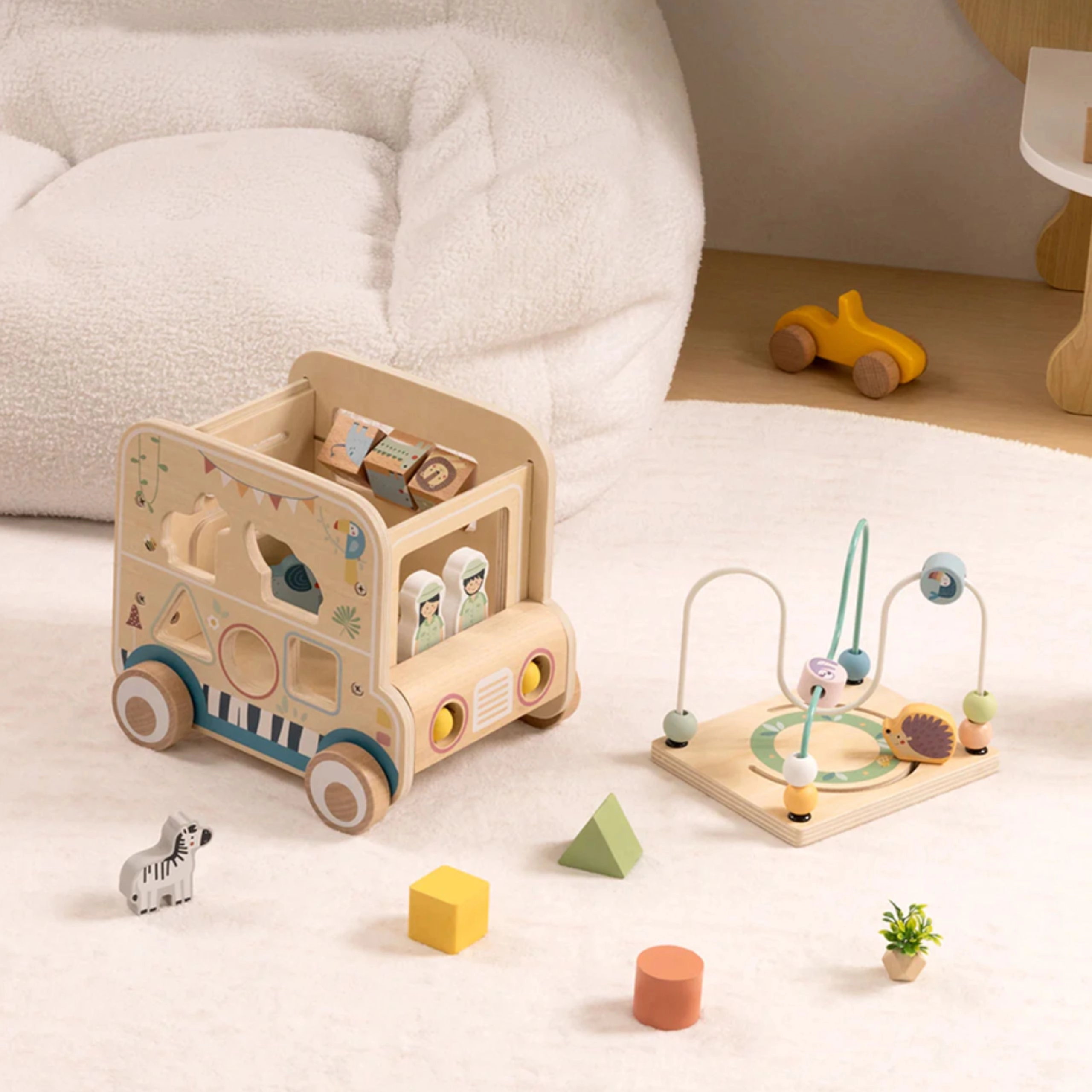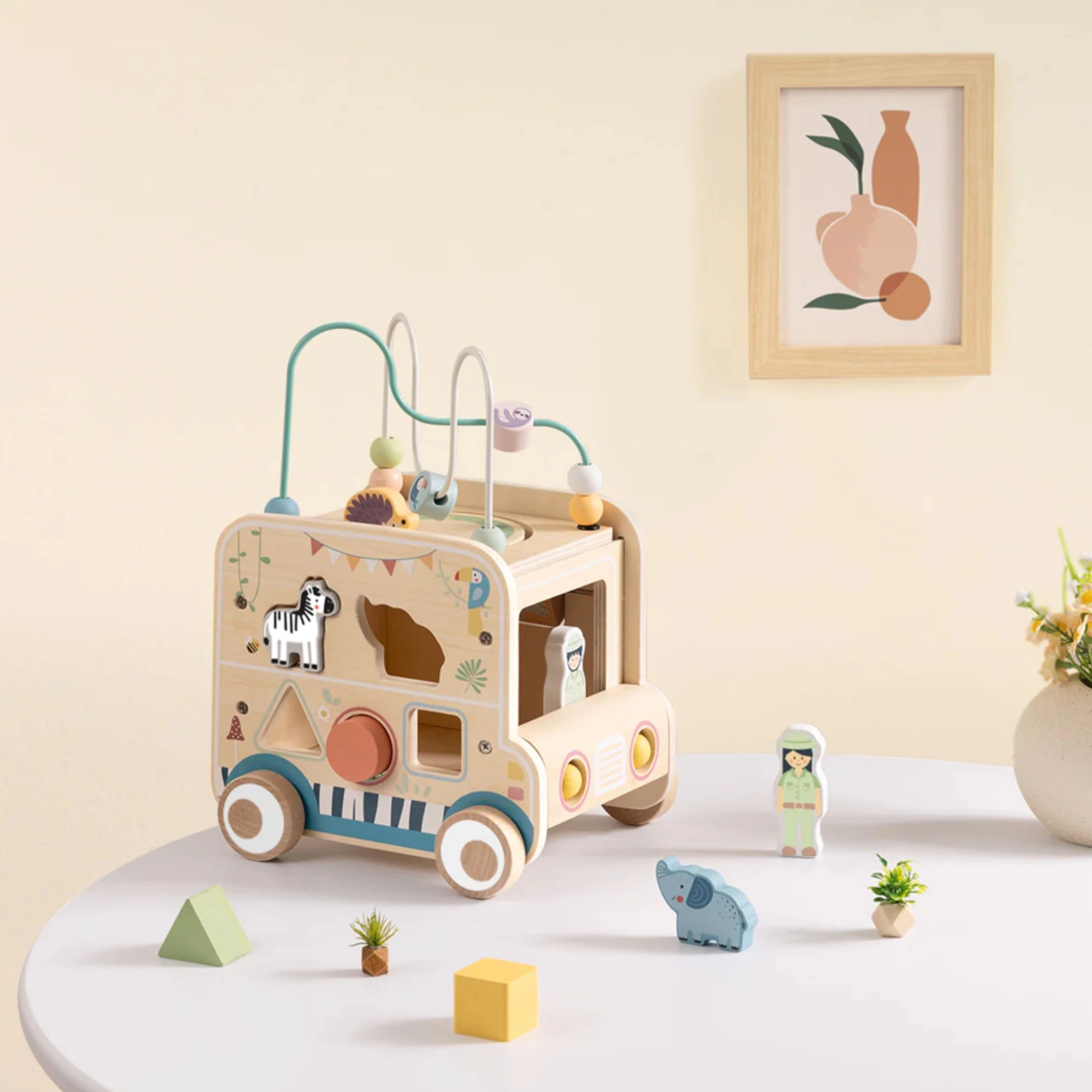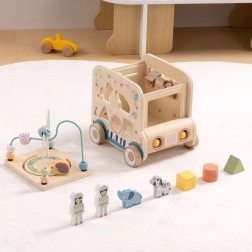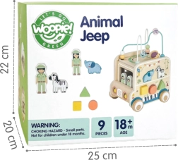Ontdek een speelse wereld met de houten actieve kubus in de vorm van een safari-auto van het merk WOOPIE GREEN. Dit multifunctionele speelgoed combineert een motorische kralenbaan, vormensorteren, draaiende tandwielen en afbeeldingsblokjes om de fijne motoriek, coördinatie en creatieve spel van kinderen vanaf 18 maanden te stimuleren.