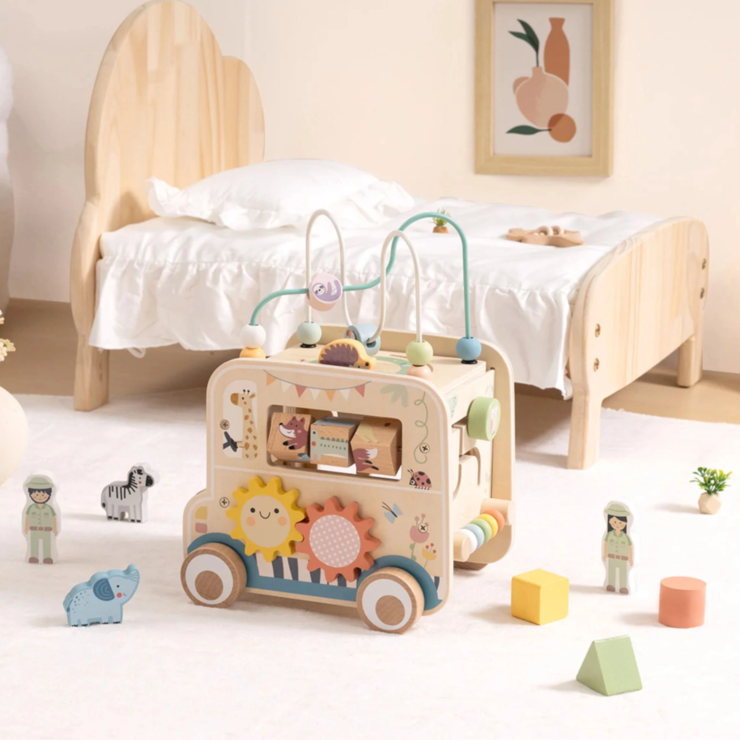 De houten actieve kubus/safari-auto biedt kinderen eindeloze ontdekkingsmogelijkheden. Van de afneembare motoriekbaan met kralen, via het labyrint en de tandwielen, tot de draaiende blokjes met dieren – elke zijde biedt een nieuwe uitdaging. Het ontwerp in zachte kleuren en de gladde afwerking zorgen voor veilig spel en vaardigheidsontwikkeling.
