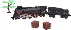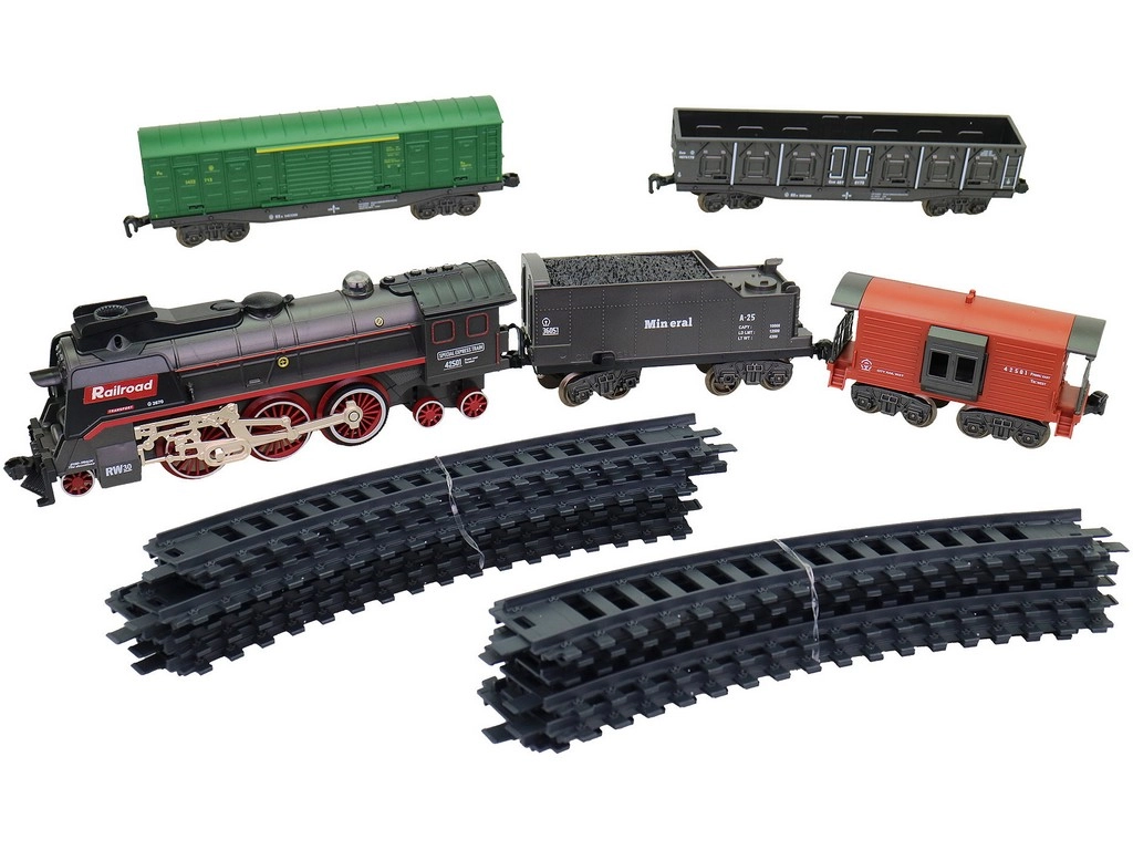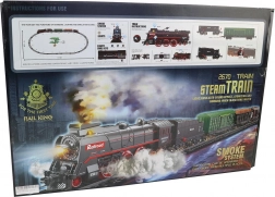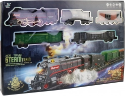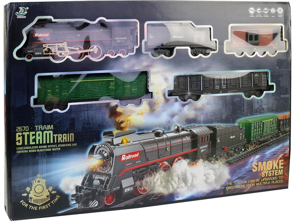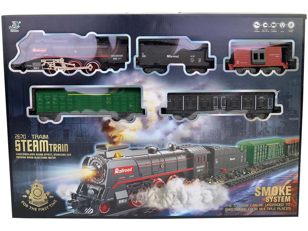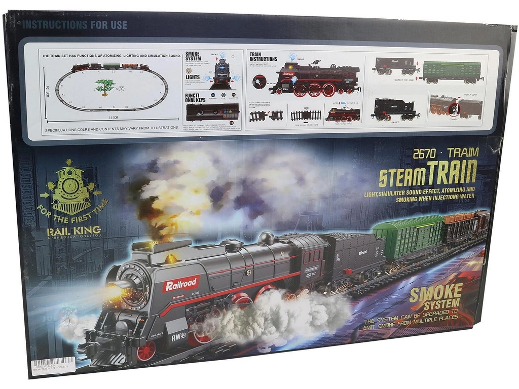 Deze stoomtreinset biedt kinderen een authentieke rijervaring – uit de schoorsteen en het onderstel komt realistische stoom, de locomotief licht op en produceert stoomtreingeluiden. Dankzij de eenvoudige montage van de rails bouw je in een mum van tijd een grote ovale baan van 151 × 92,5 cm.