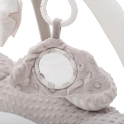 Een spiegeltje, knisperende elementen, piepertje, zacht bijtspeeltje, belletje en een speelgoedje met melodie ondersteunen oog-handcoördinatie en de ontwikkeling van de fijne motoriek.