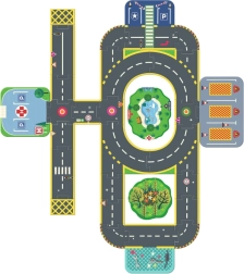 - Wegen met rijstroken, zebrapaden, rotonde, parkeerplaats, ziekenhuis, helihaven, speeltuin, vijver