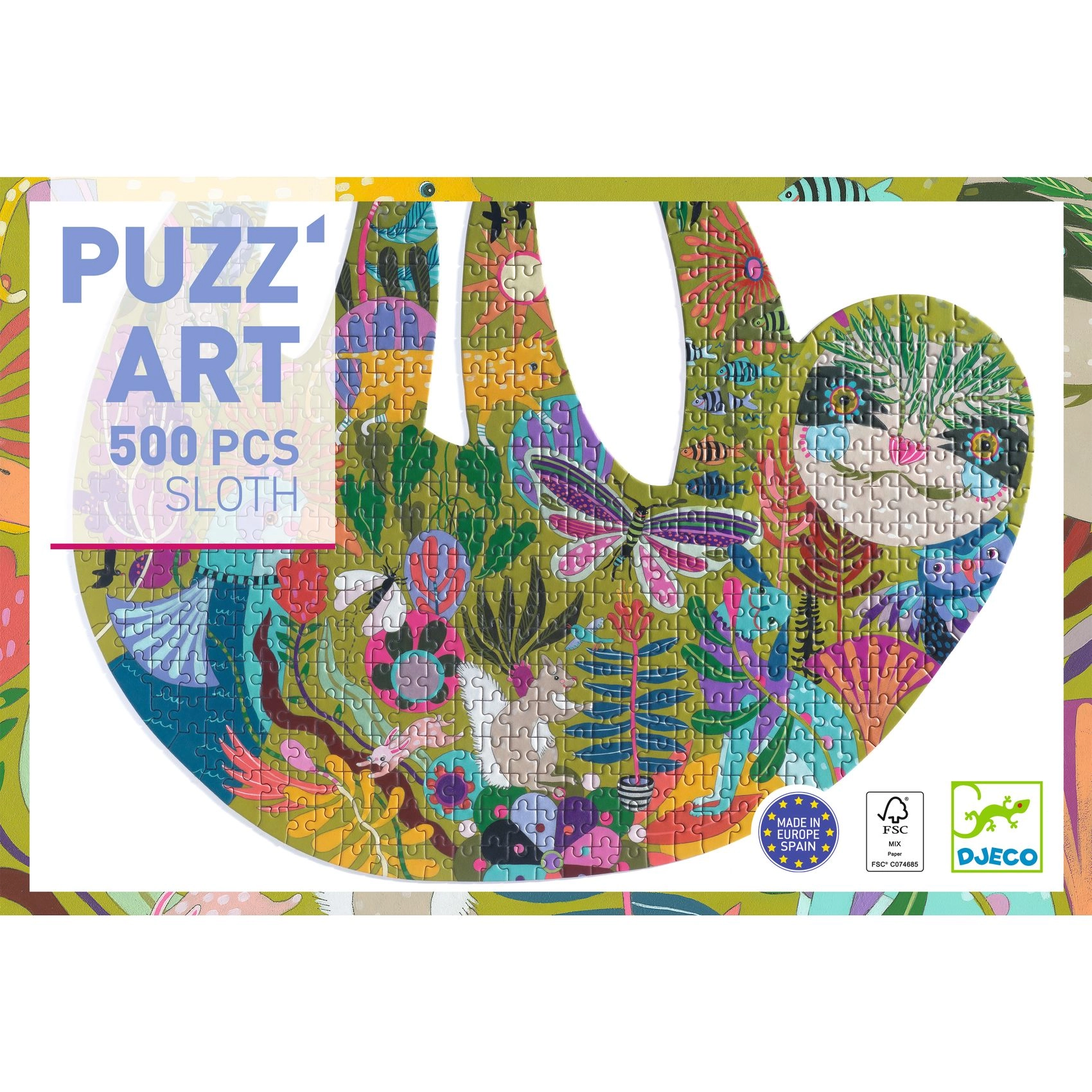 Betreed de wereld van fantasie met de originele Djeco Puzz’Art Luiaard puzzel met 500 stukjes. De ongewone silhouetvorm en de rijke illustraties bieden een uitdaging voor kinderen én volwassenen, een uitstekende training van de aandacht en een ontspannende ervaring tijdens het leggen.